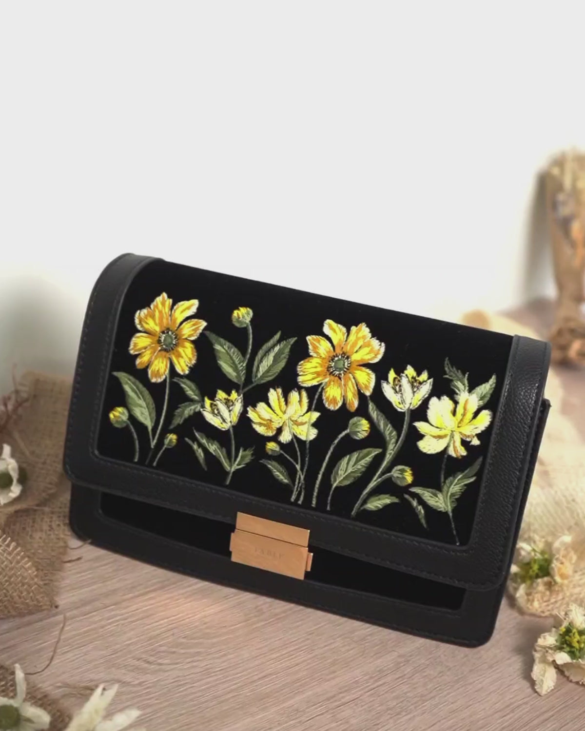 Black handbag with floral embroidery on a white background
