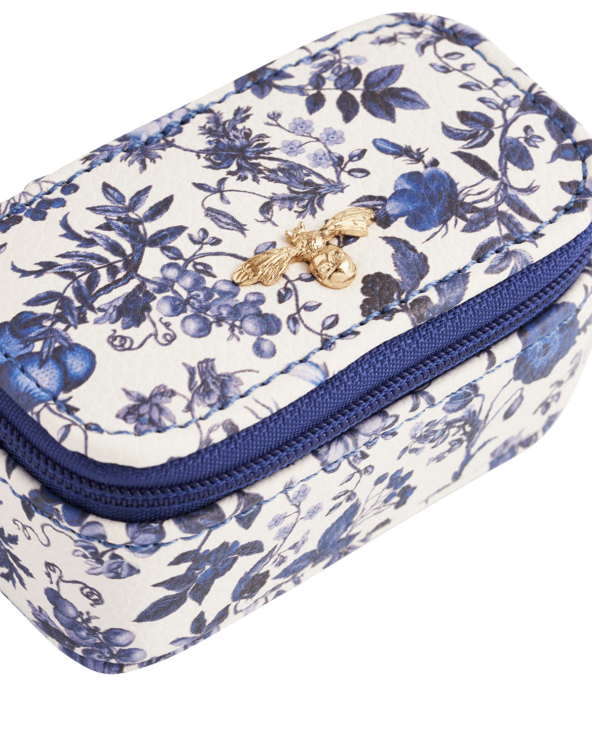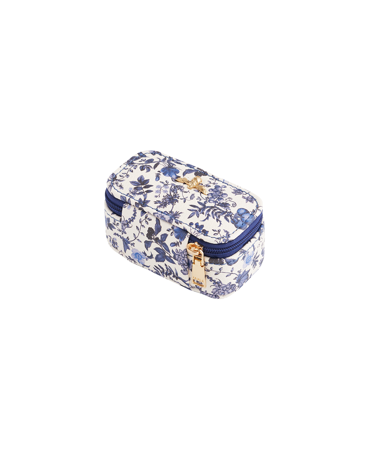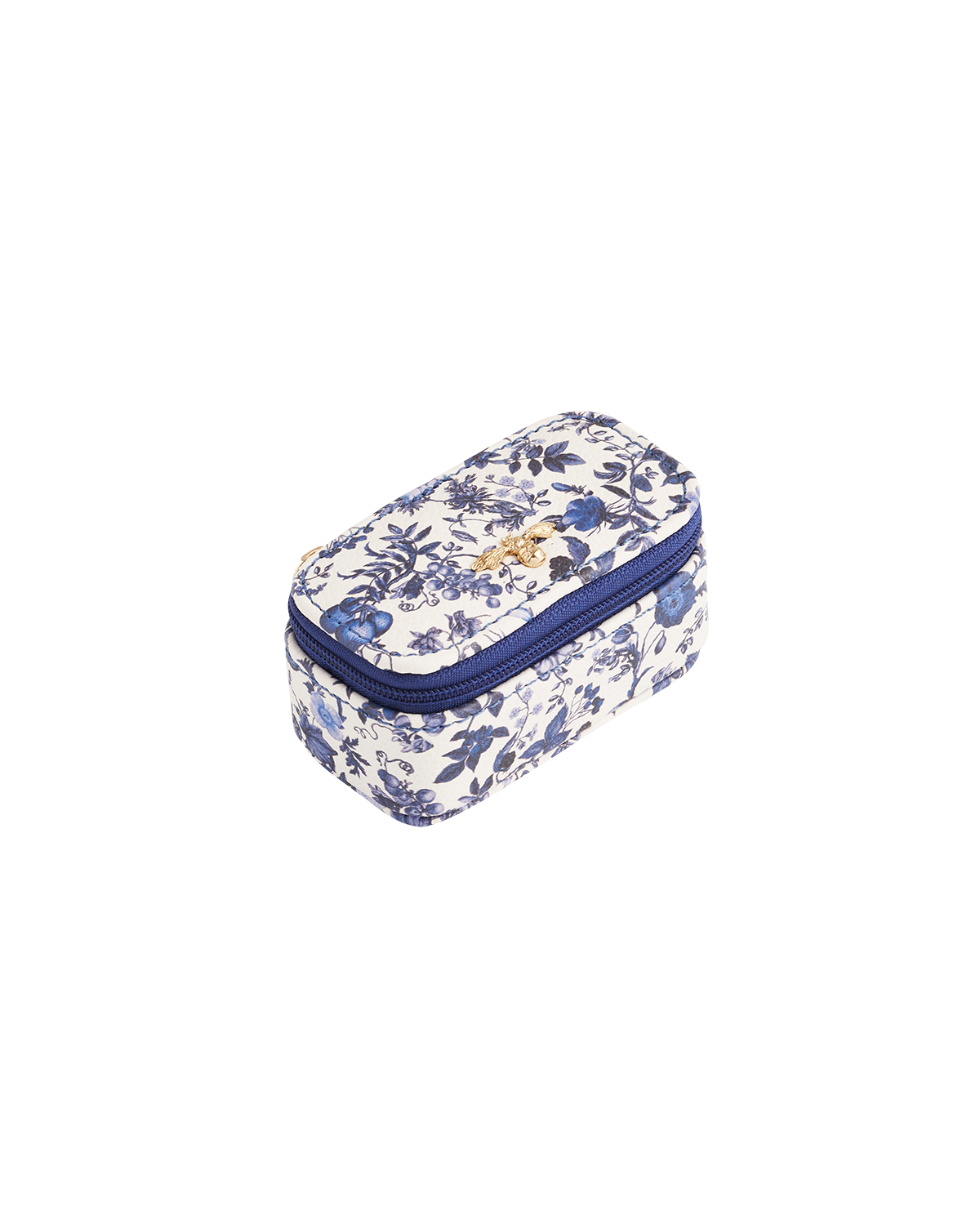 Blue floral-patterned mini jewellery case with a gold bee detail on a white background