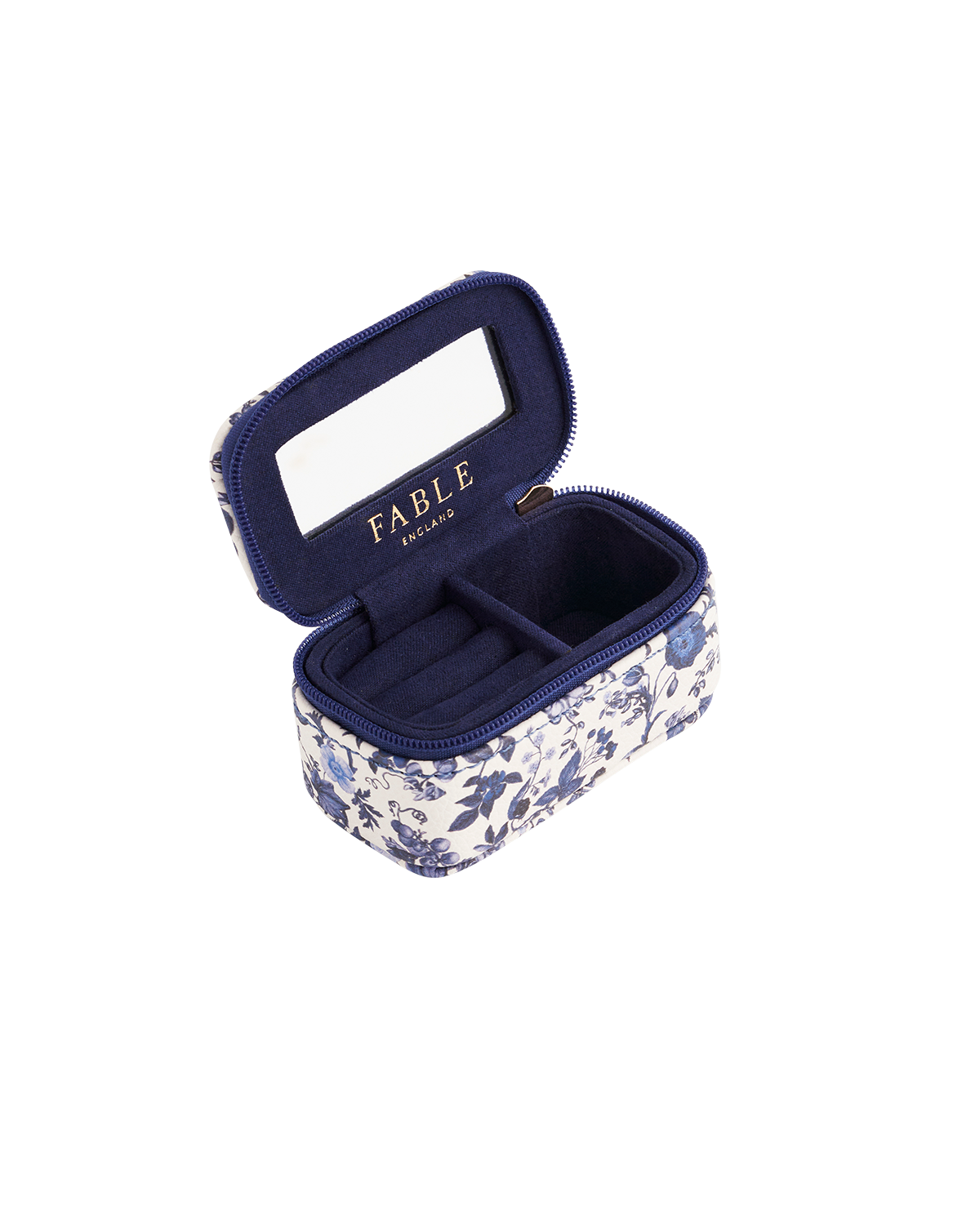 Navy mini  jewellery case with floral pattern and 'Fable England' branding on a white background