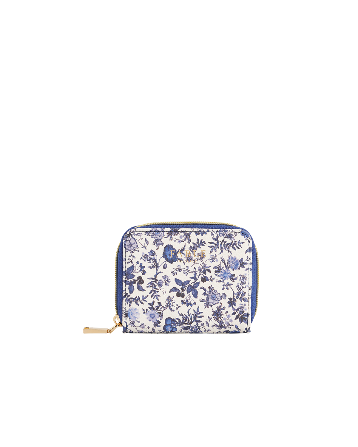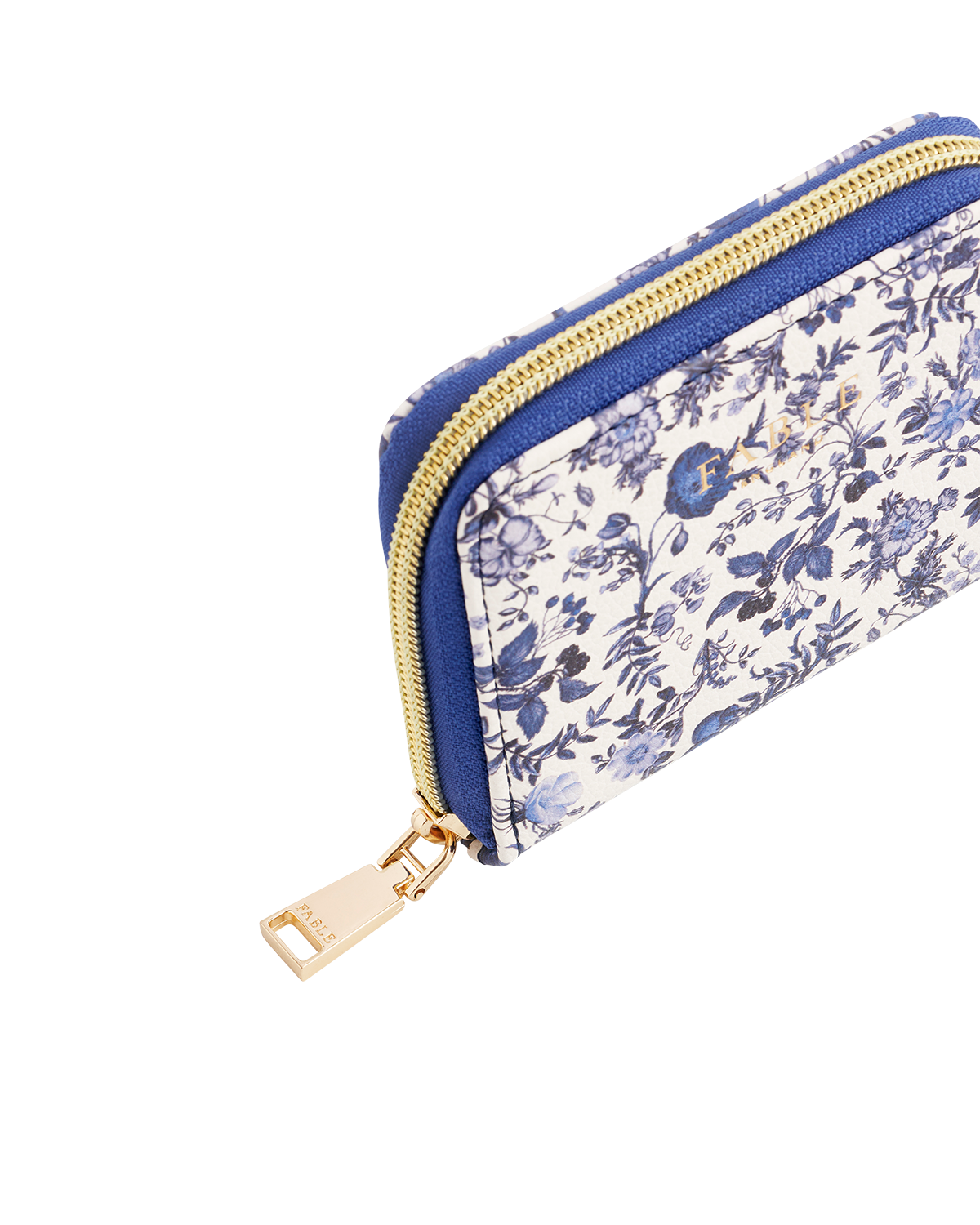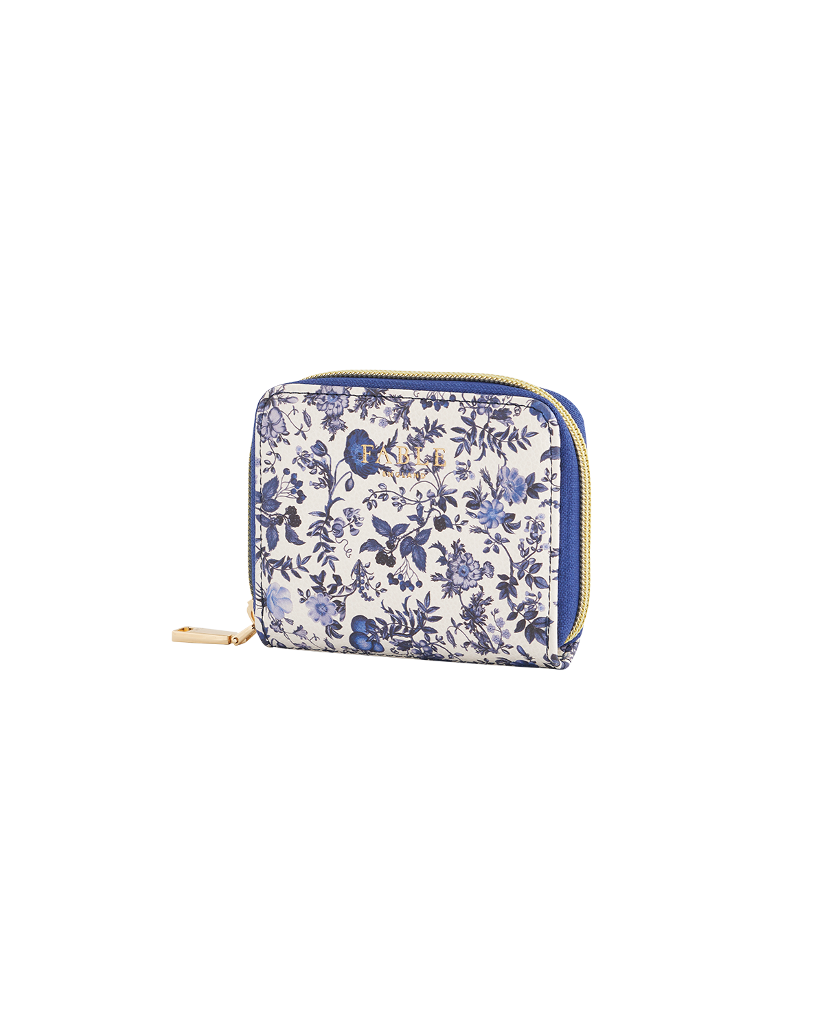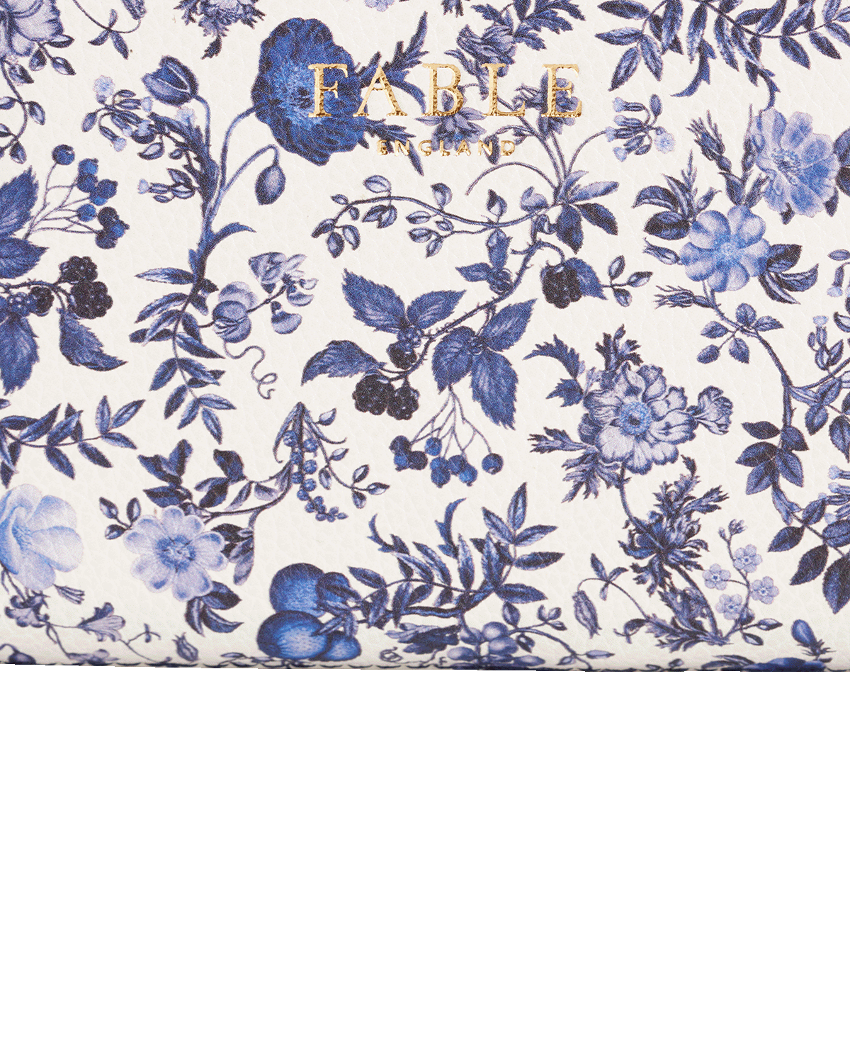 Floral pattern with blue flowers and leaves on a white background, featuring the brand 'Fable England'.
