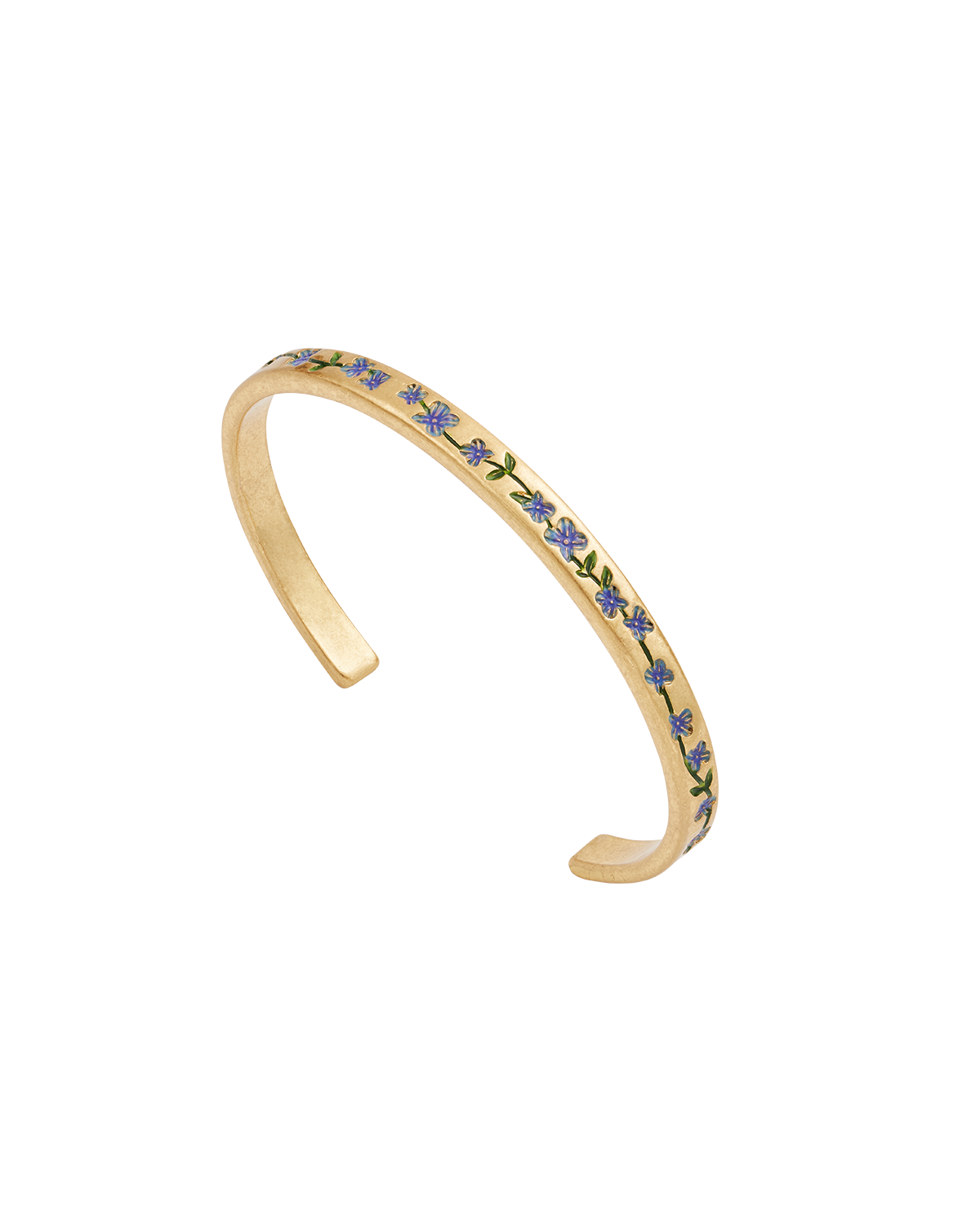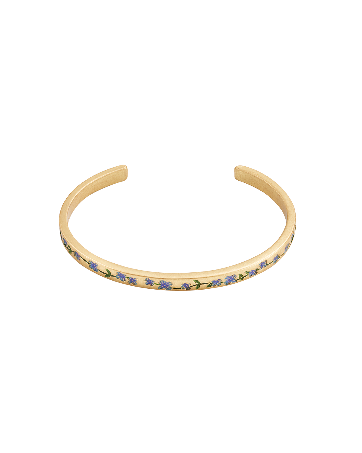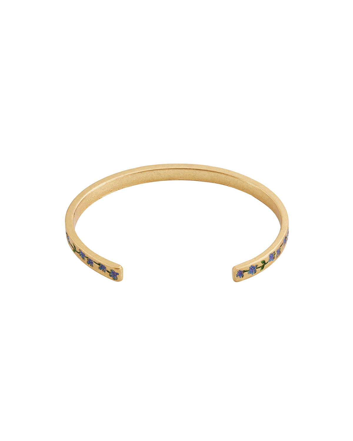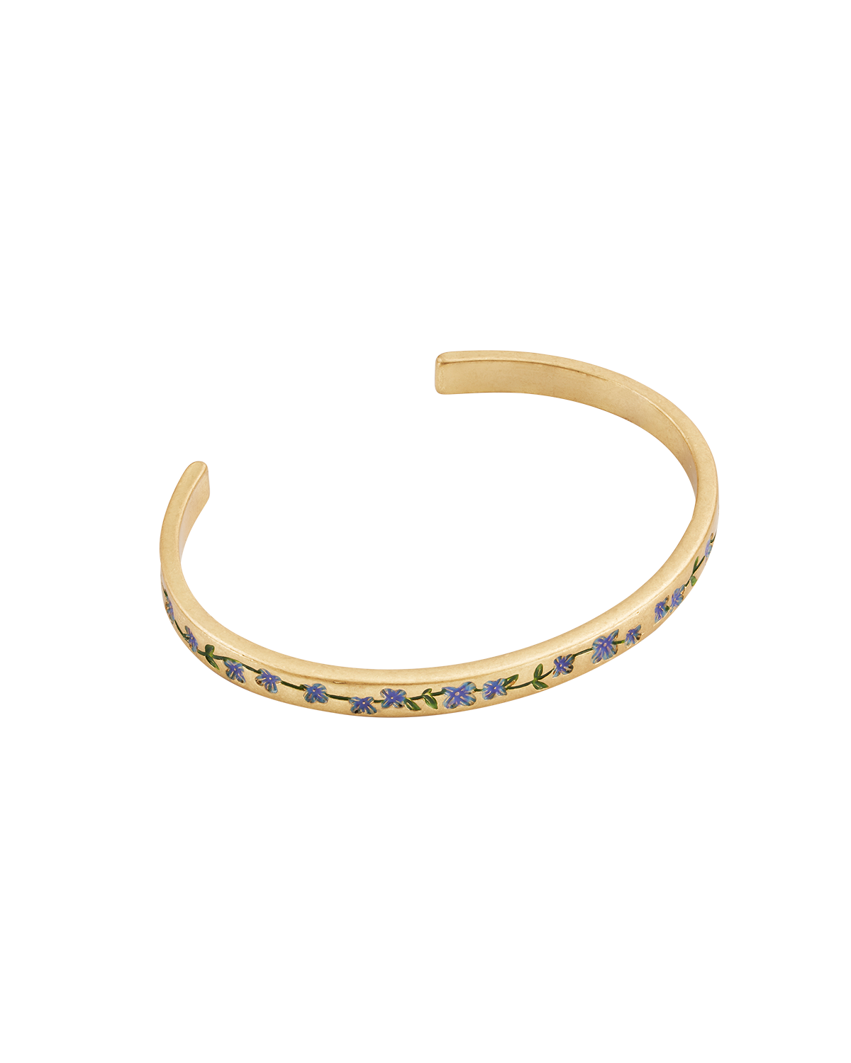Gold bangle with blue forget me not floral design on a white background