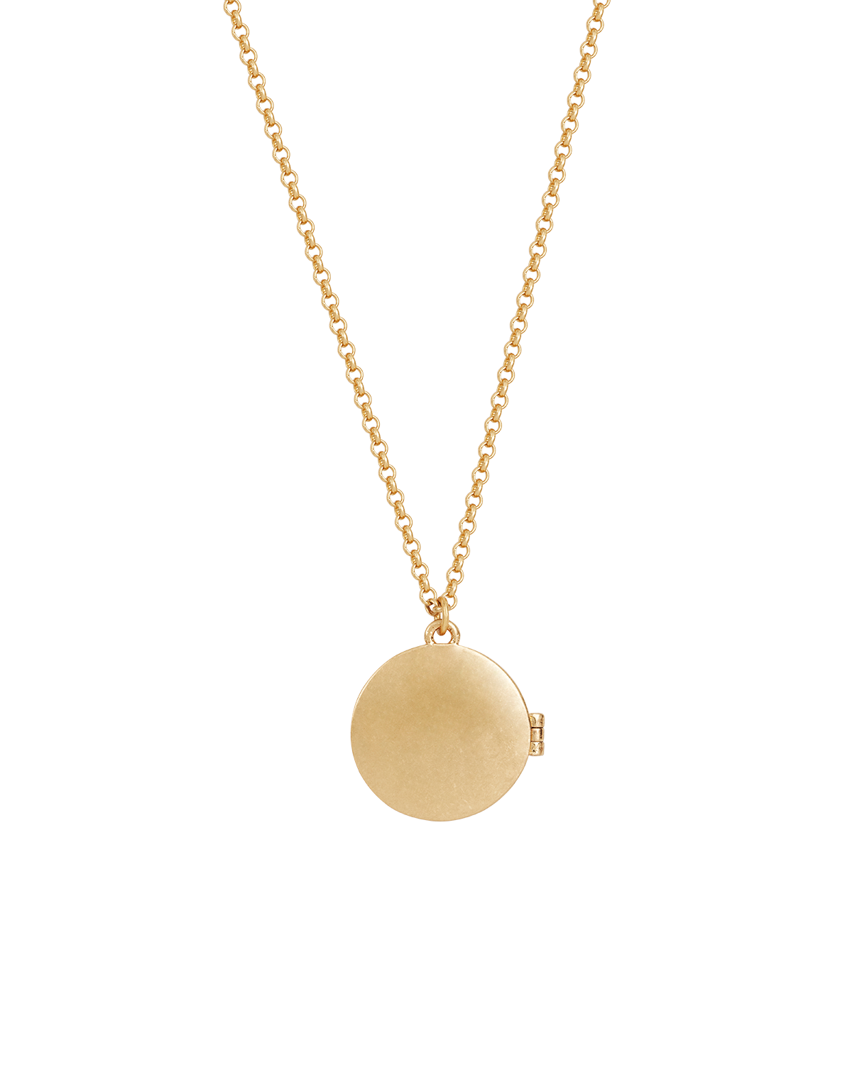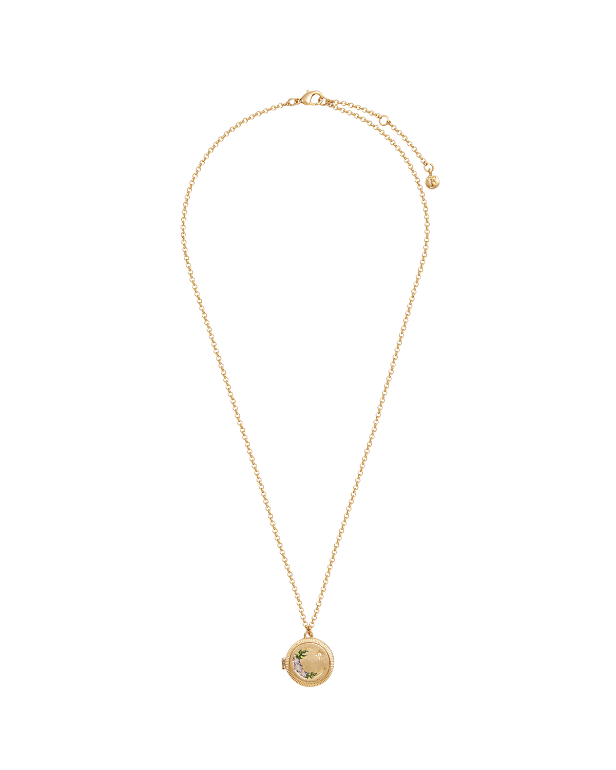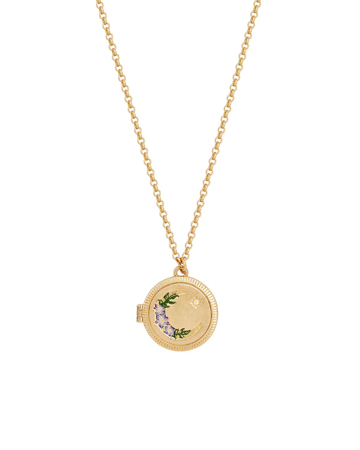 Gold necklace with a round pendant locket with floral moon design on a white background