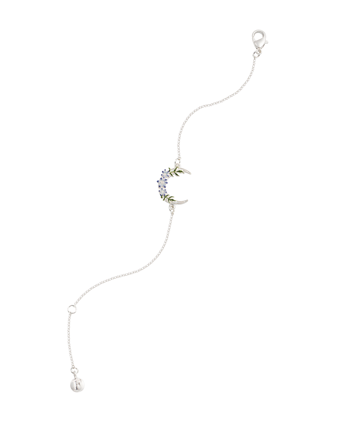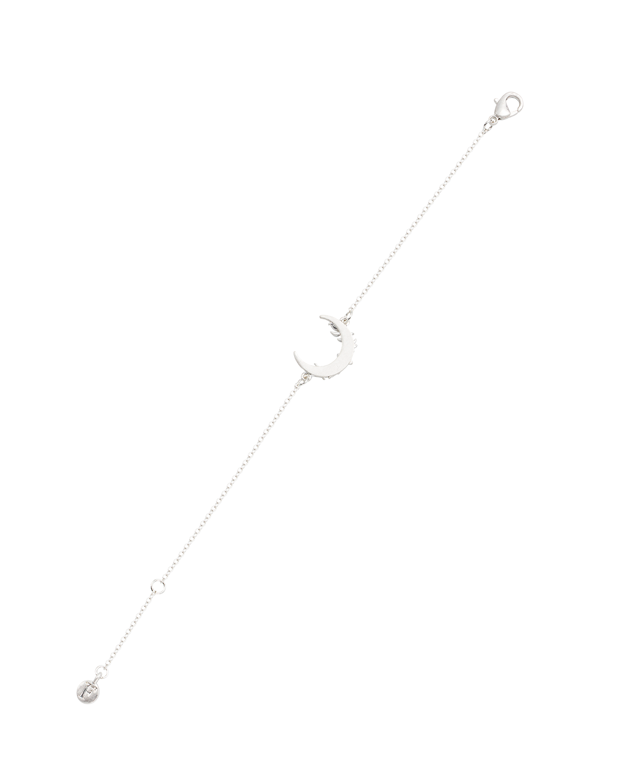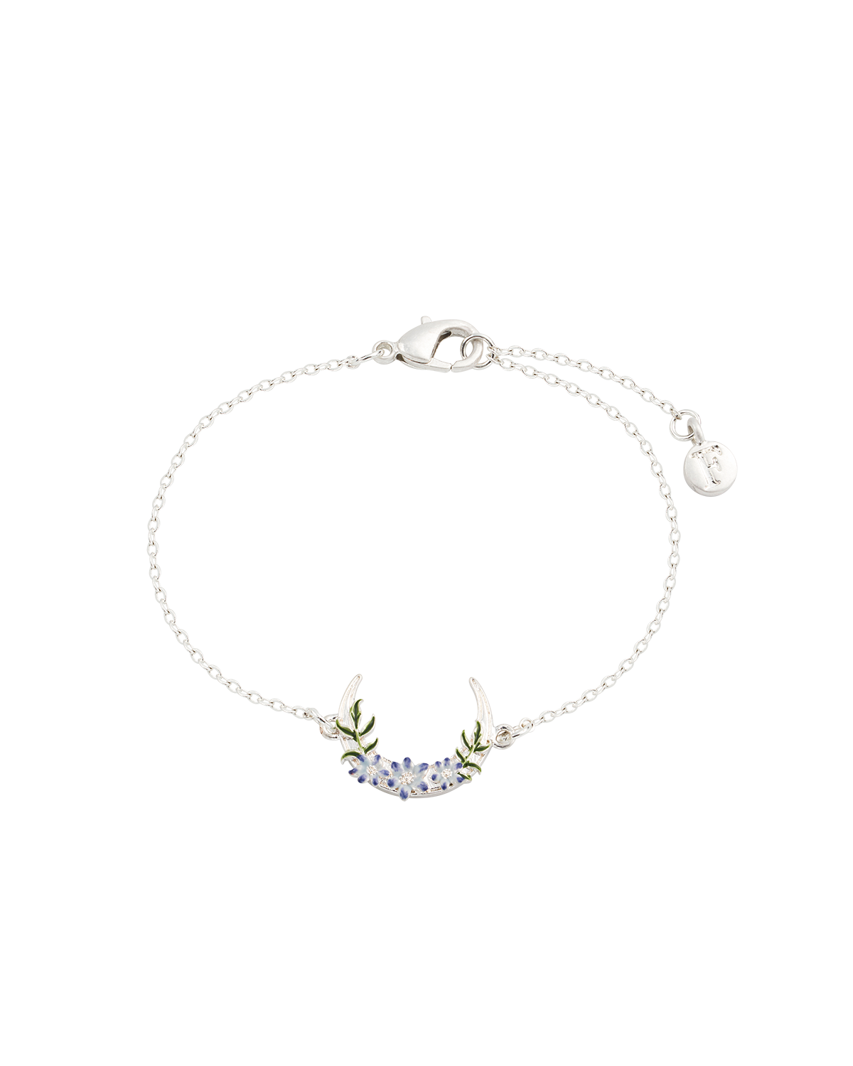 Delicate silver bracelet with afloral moon design pendant on a white background