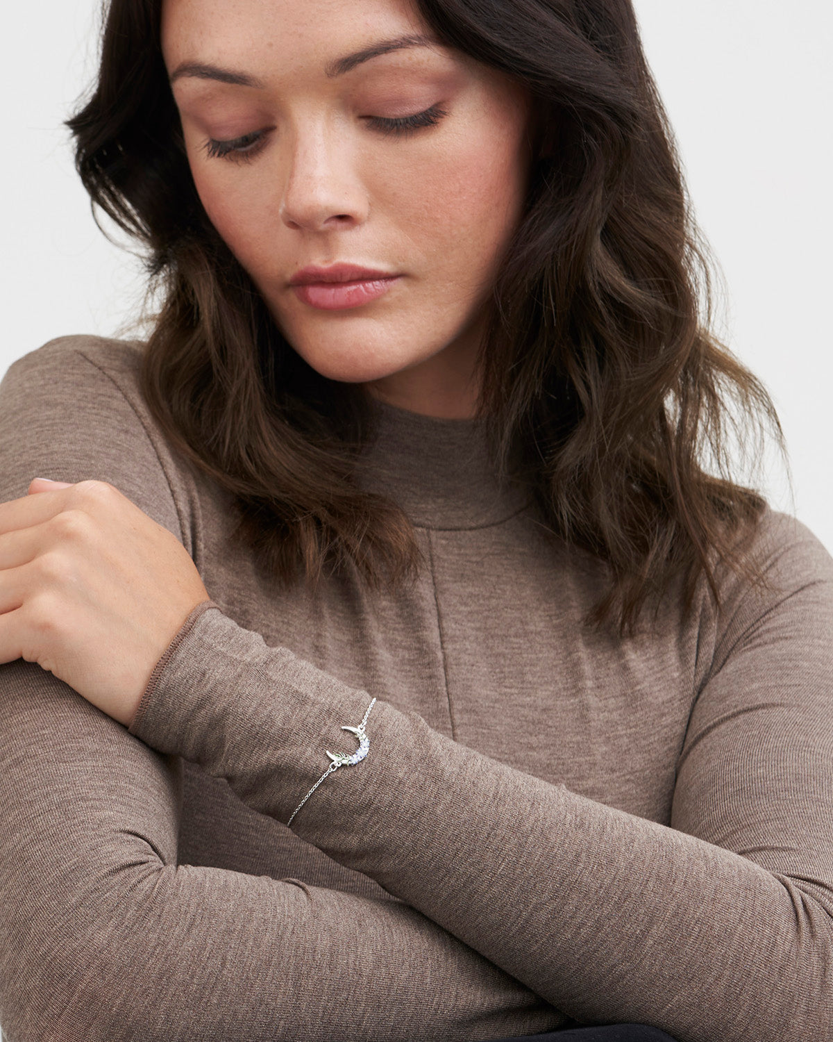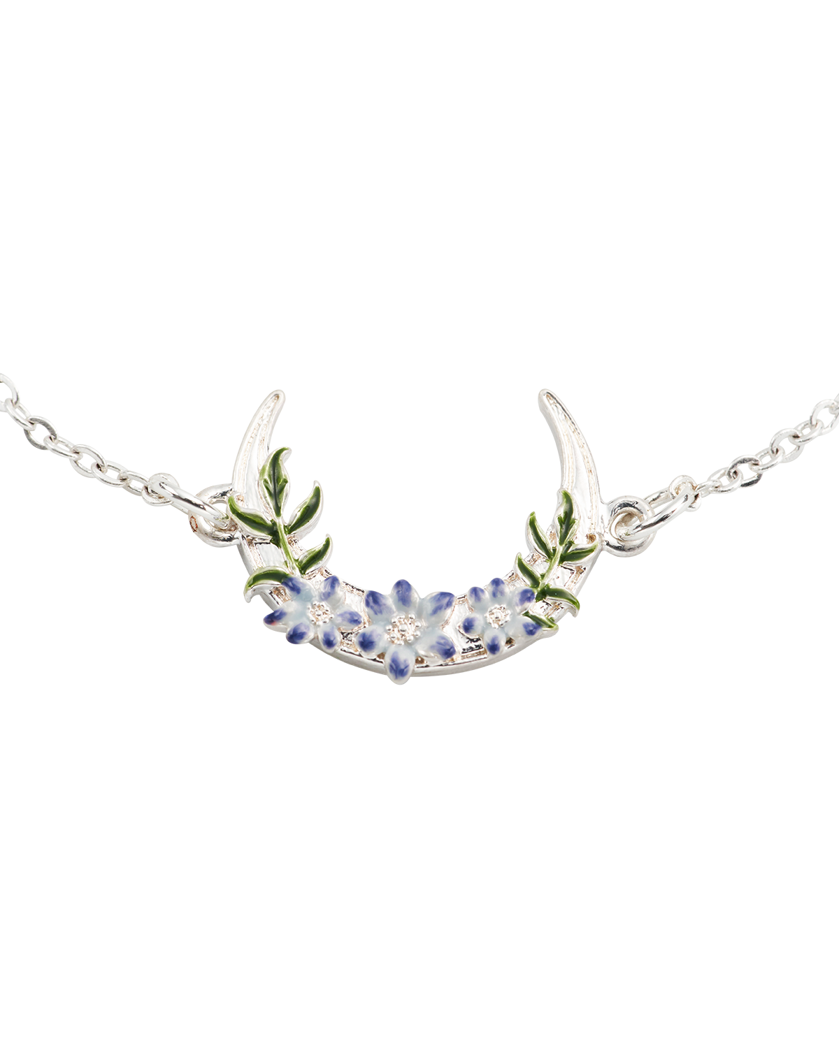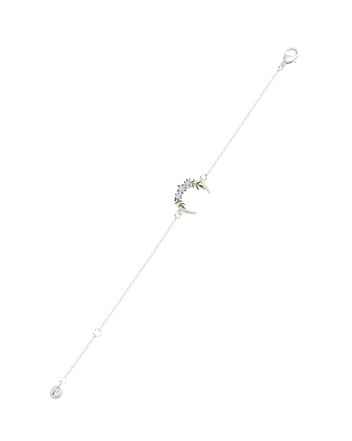 Delicate silver bracelet with afloral moon design pendant on a white background
