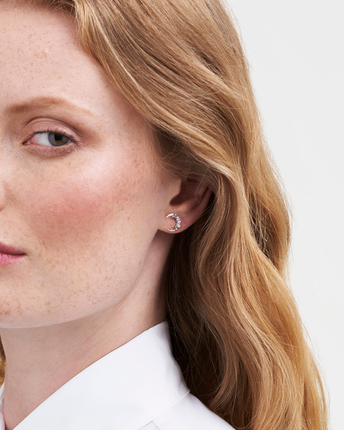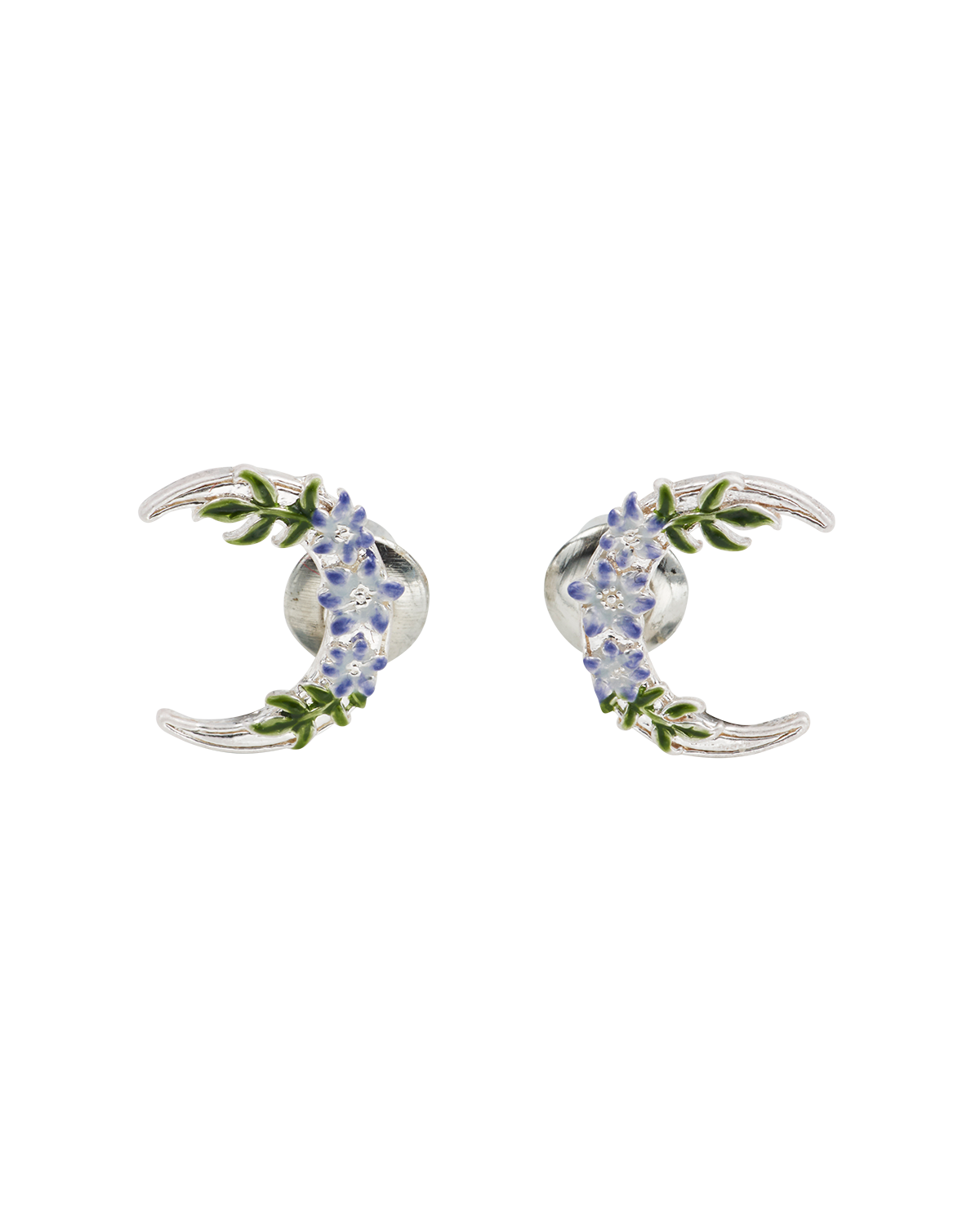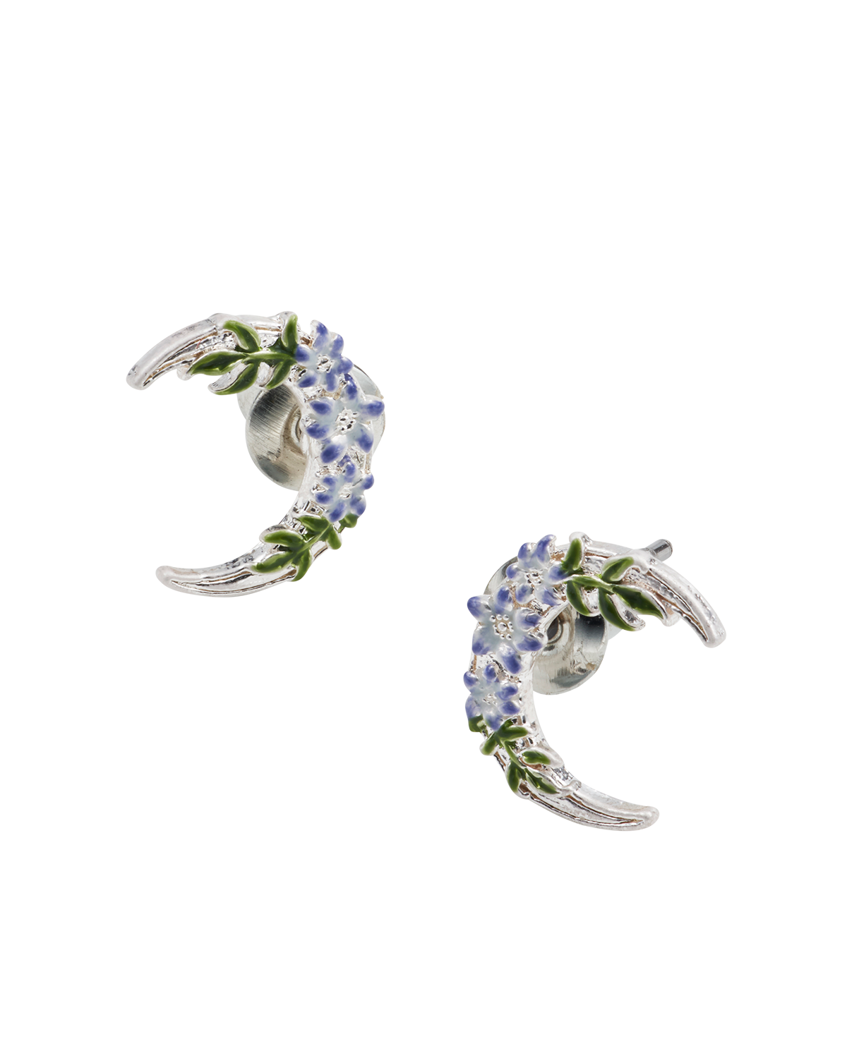 Pair of silver earrings with floral moon design on a white background