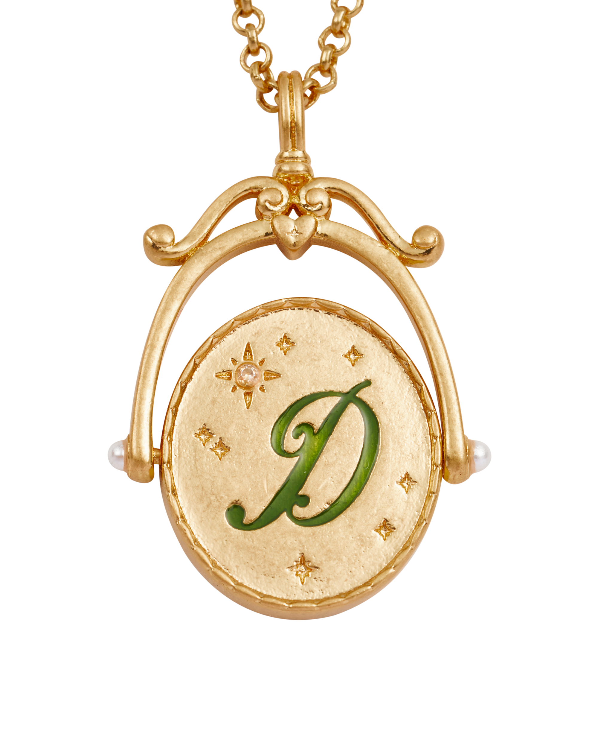 • Detail: Spinner necklace featuring an initial on the front and a delicate flower on the reverse.