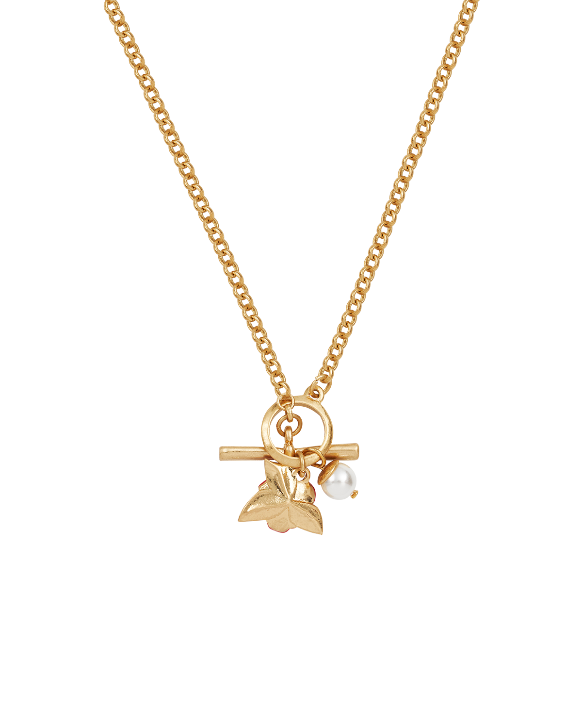 • Materials: 22ct worn gold-plated brass, zinc alloy, enamel, pearl