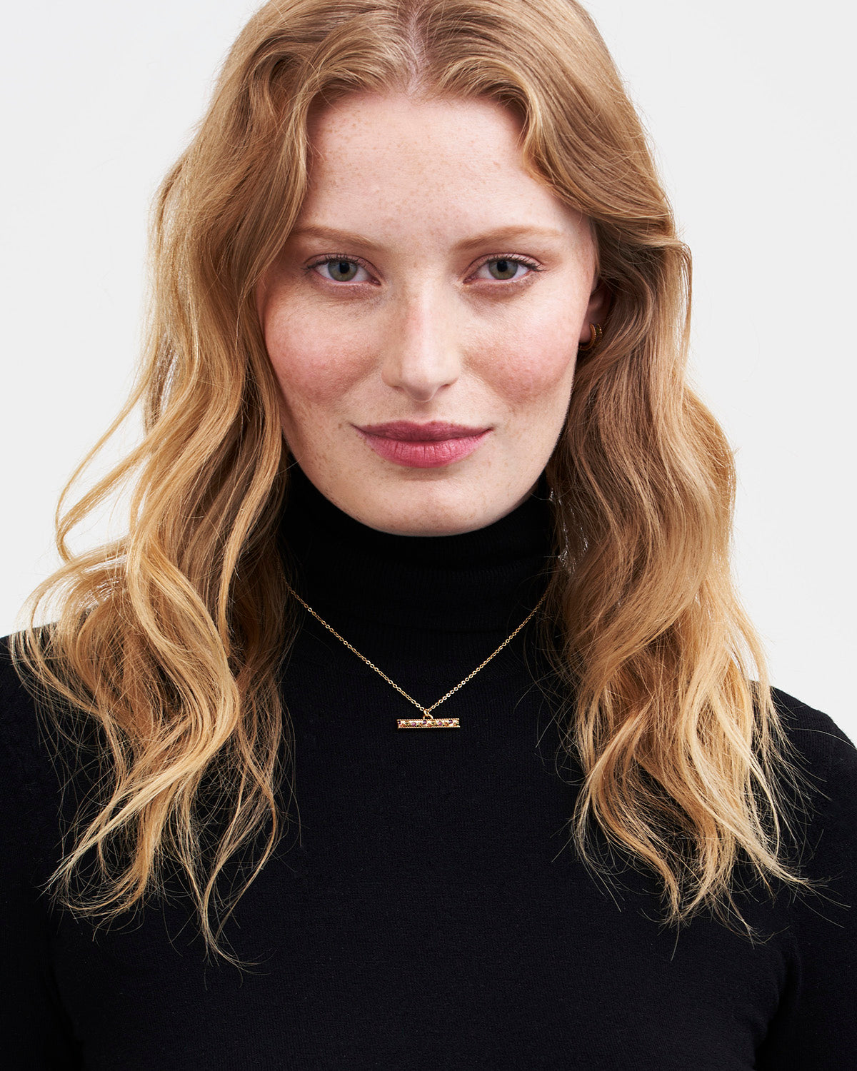 Woman with wavy blonde hair wearing a black turtleneck and gold necklace on a white background
