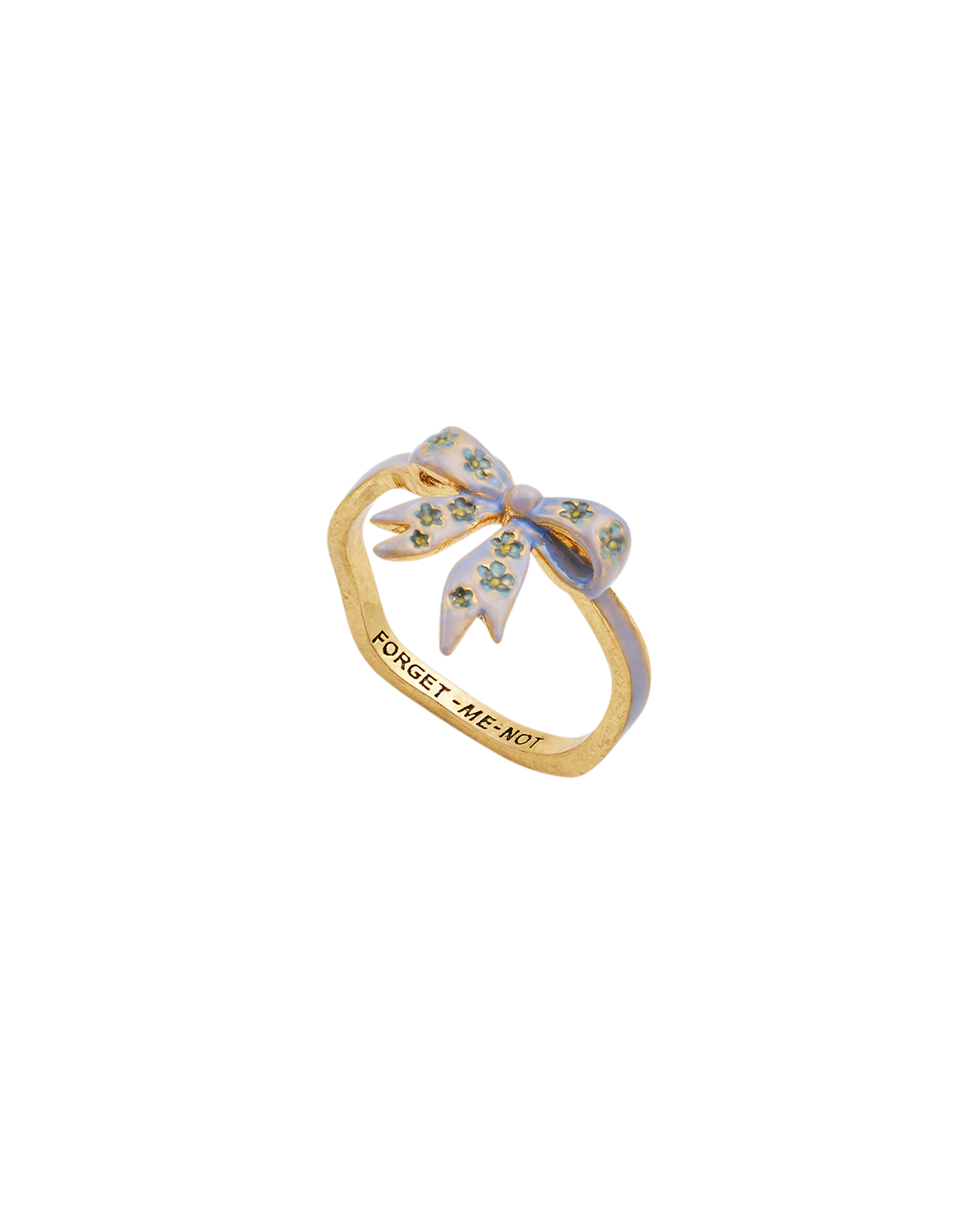 Gold ring with a blue bow and 'FORGET-ME-NOT' text on a white background