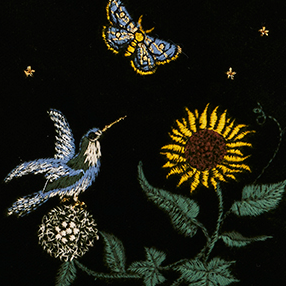Blue Forget Me Not Velvet Embroidered Pouch featuring blue birds and floral wreath design