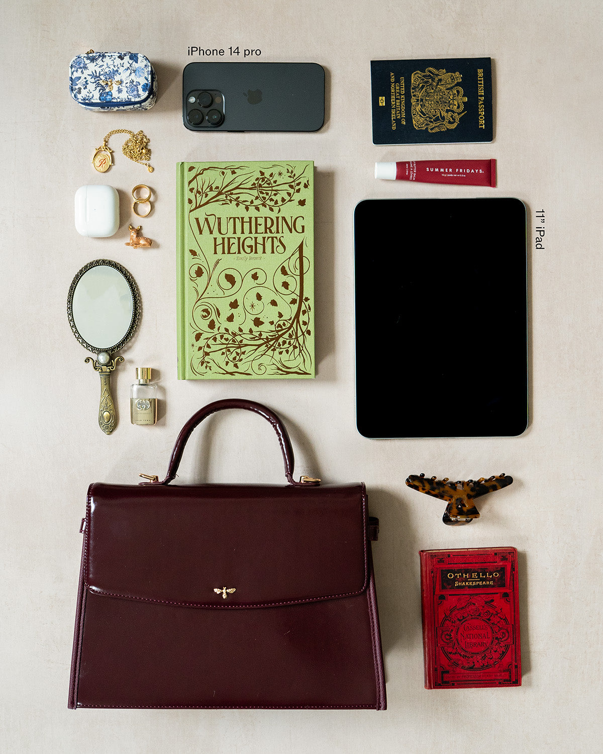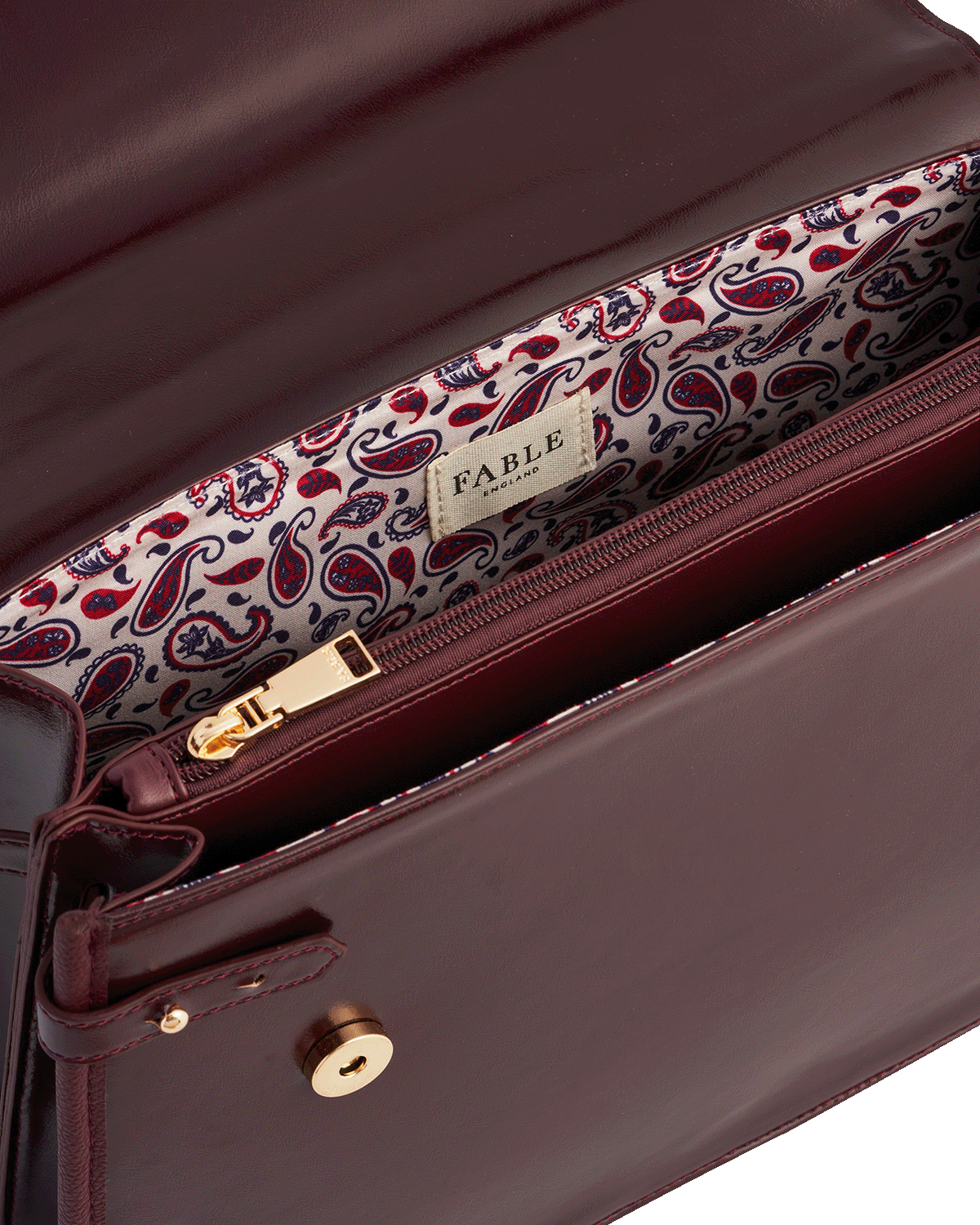 Close-up of a cherry red leather handbag with a patterned handle and 'Fable England' branding.