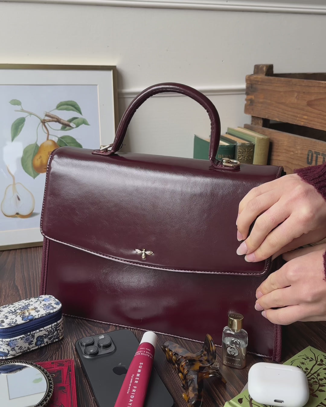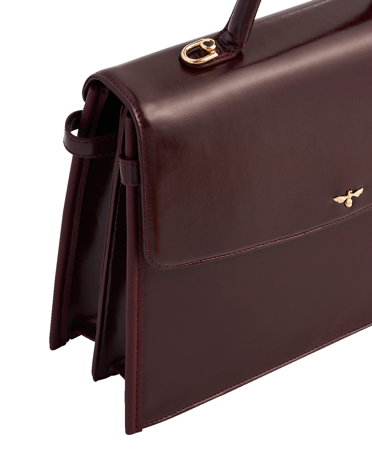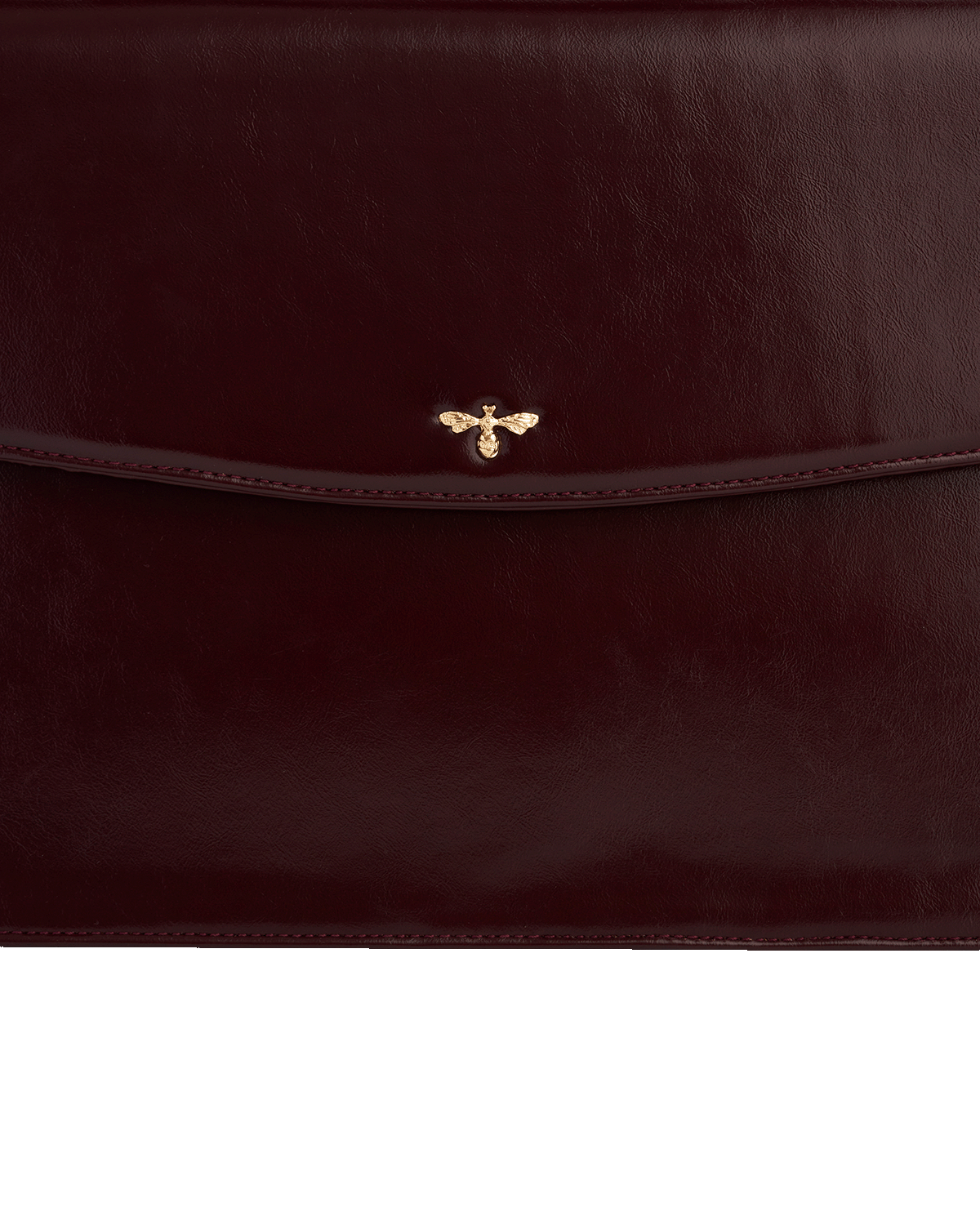 Cherry red leather clutch bag with a gold bee emblem on a white background