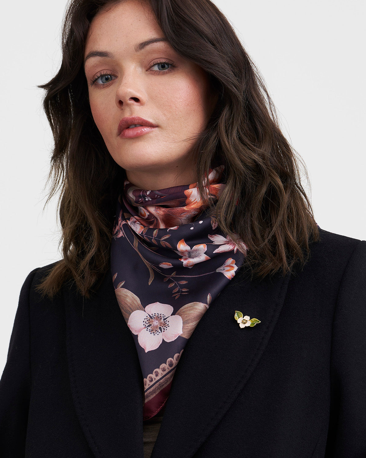 Woman wearing a floral scarf and black coat on a white background