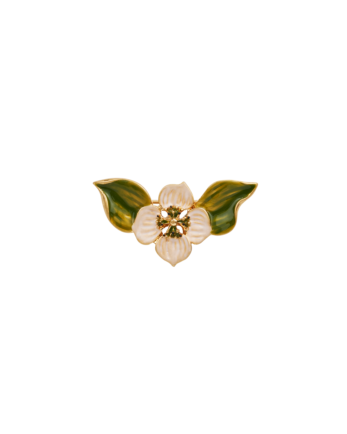 Floral brooch with green leaves and gold accents on a white background