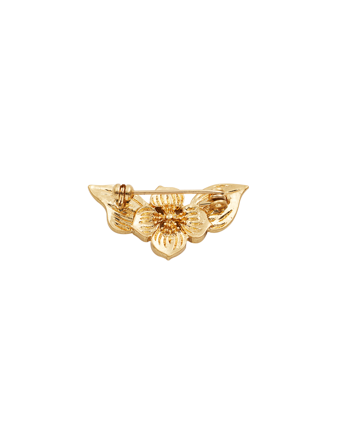 Back of gold floral brooch on a white background