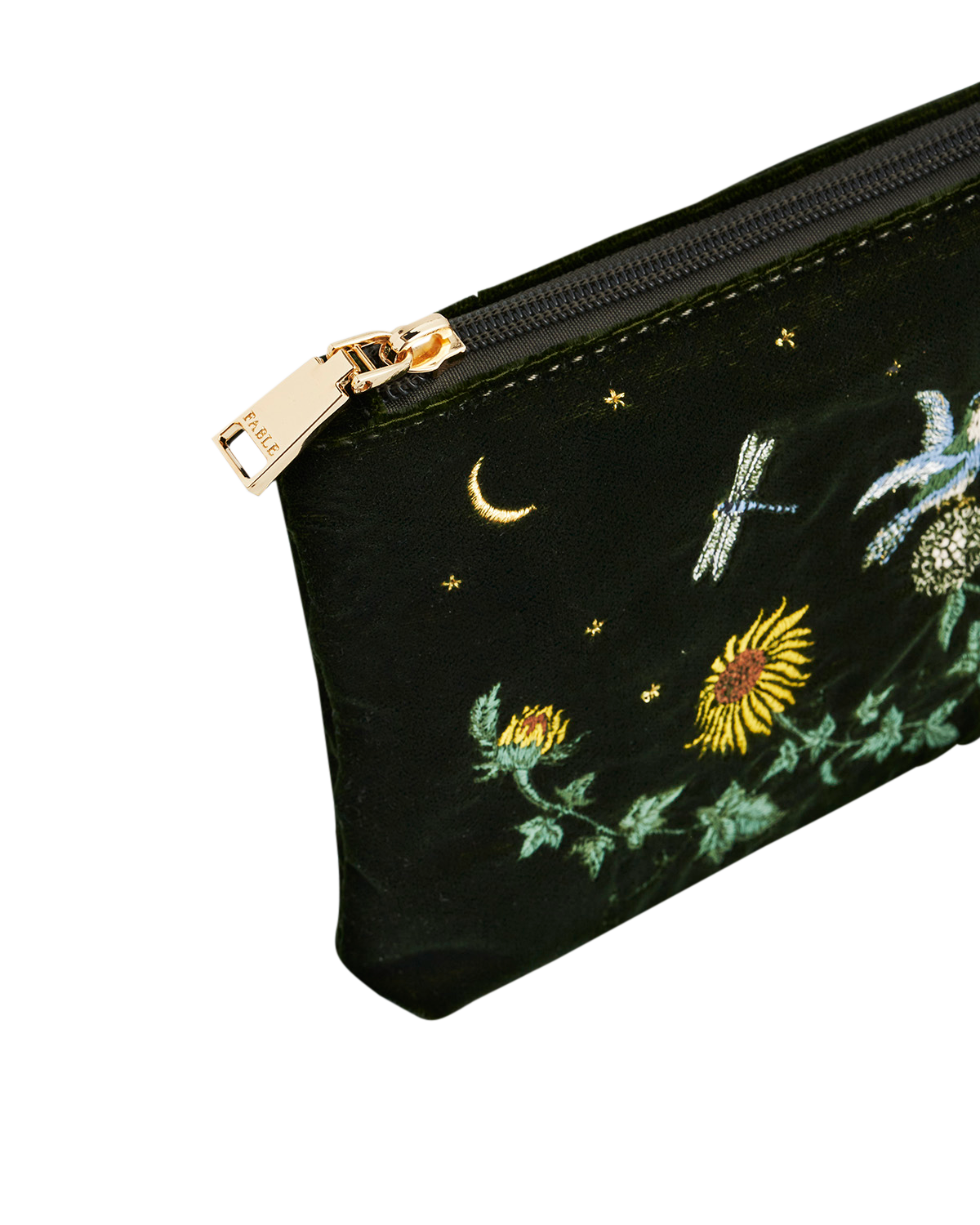 Embroidered pouch with Fable label on a white background
