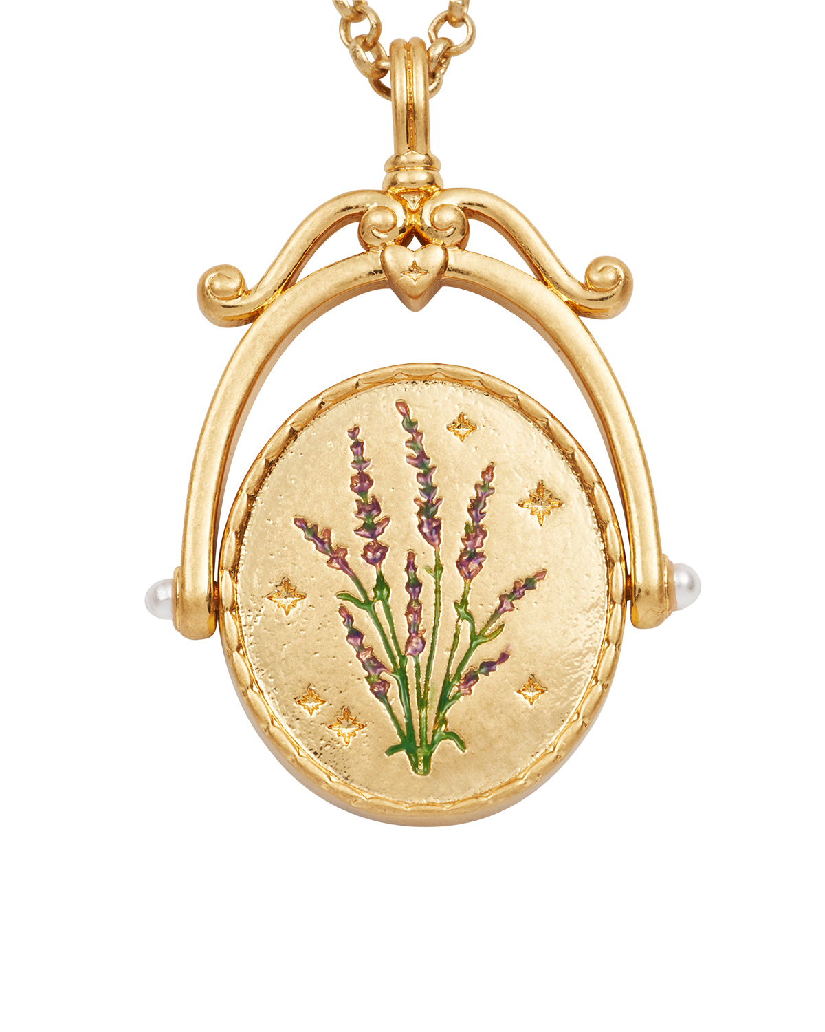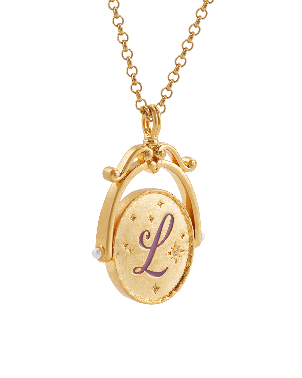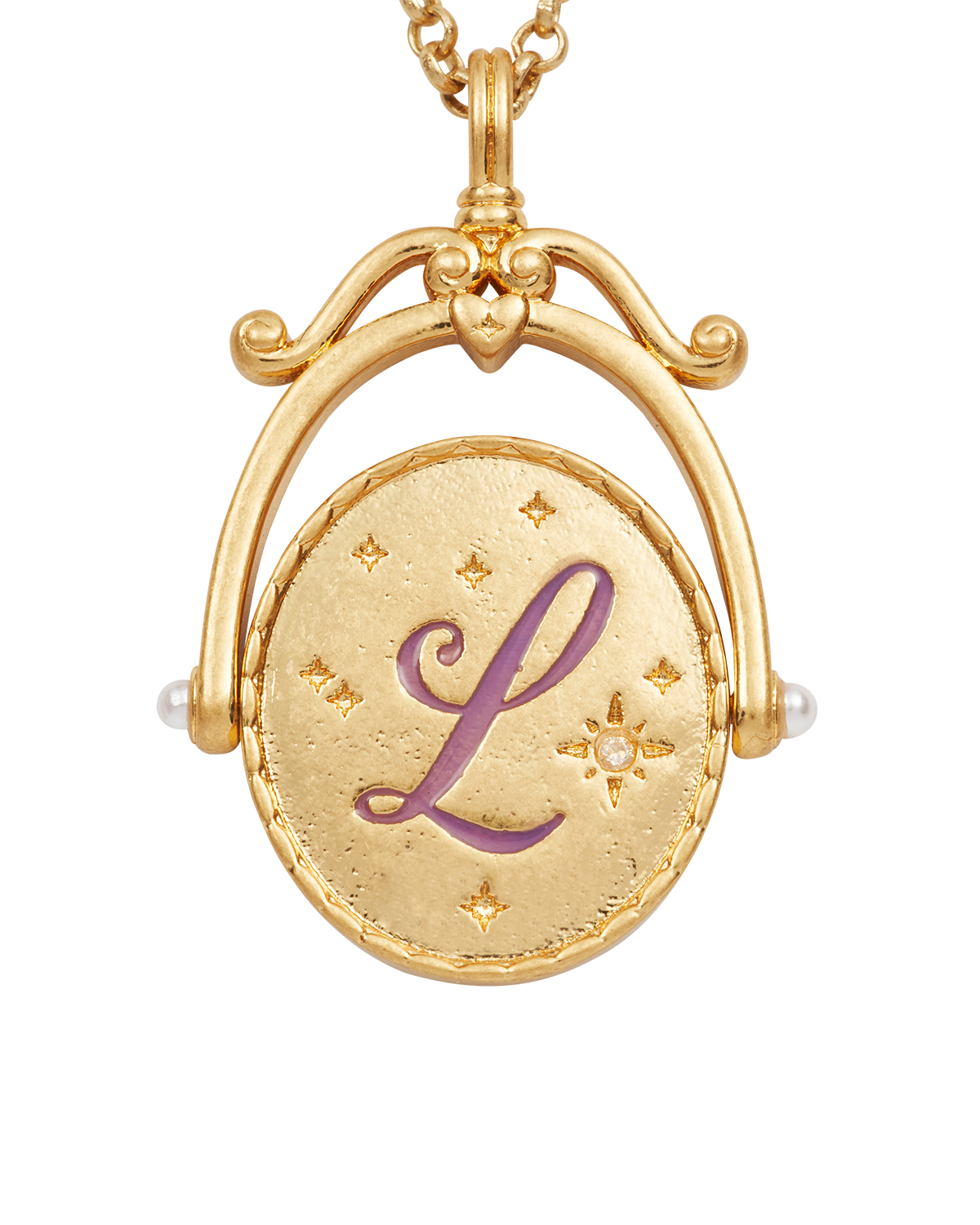 Dual-sided spinner pendant with "L" initial and lavender flower