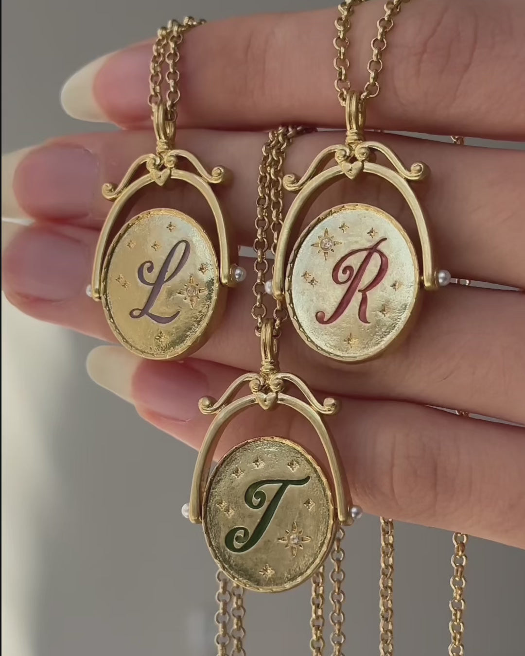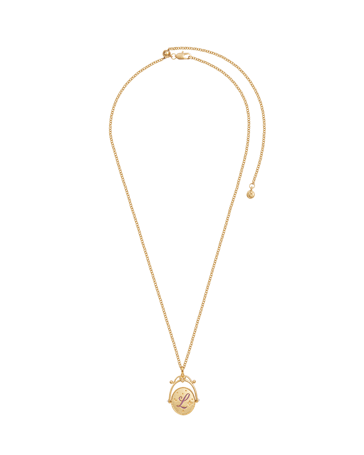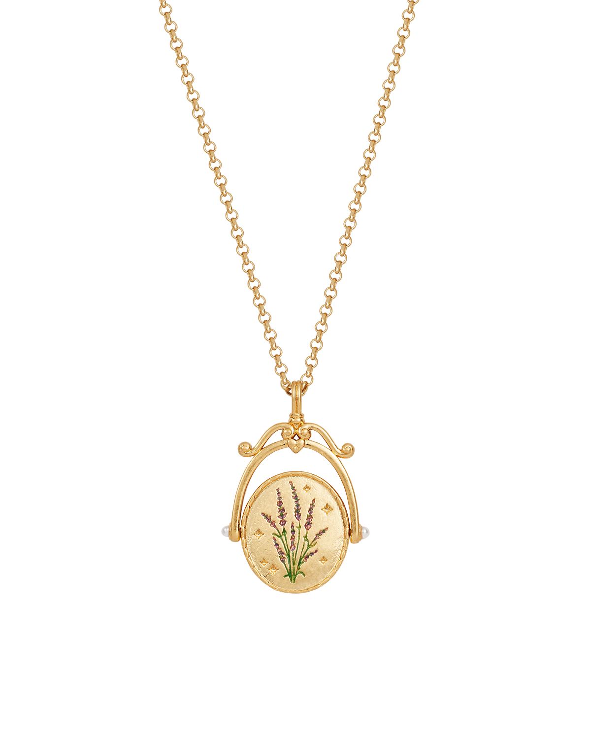 Dual-sided spinner pendant with "L" initial and lavender flower