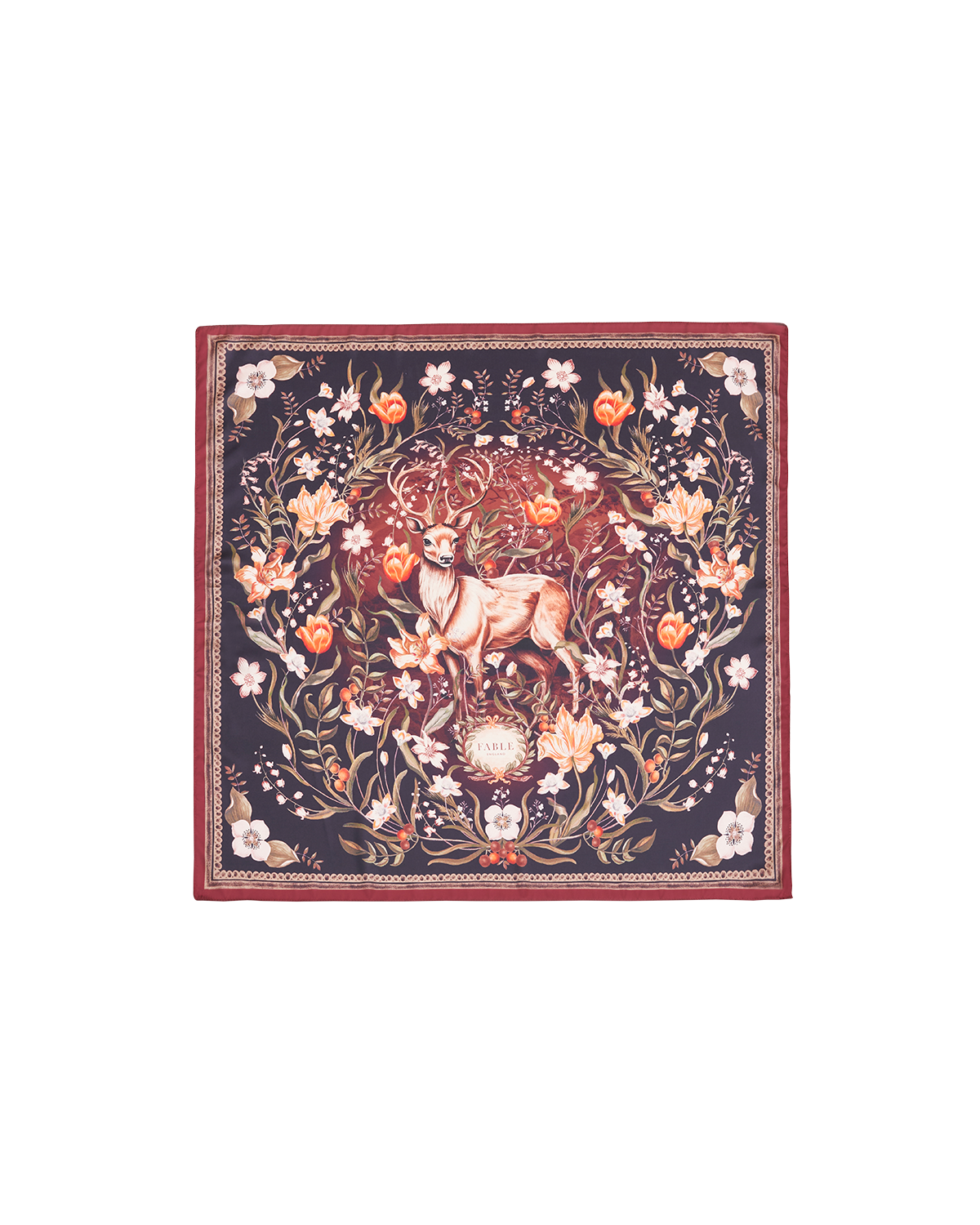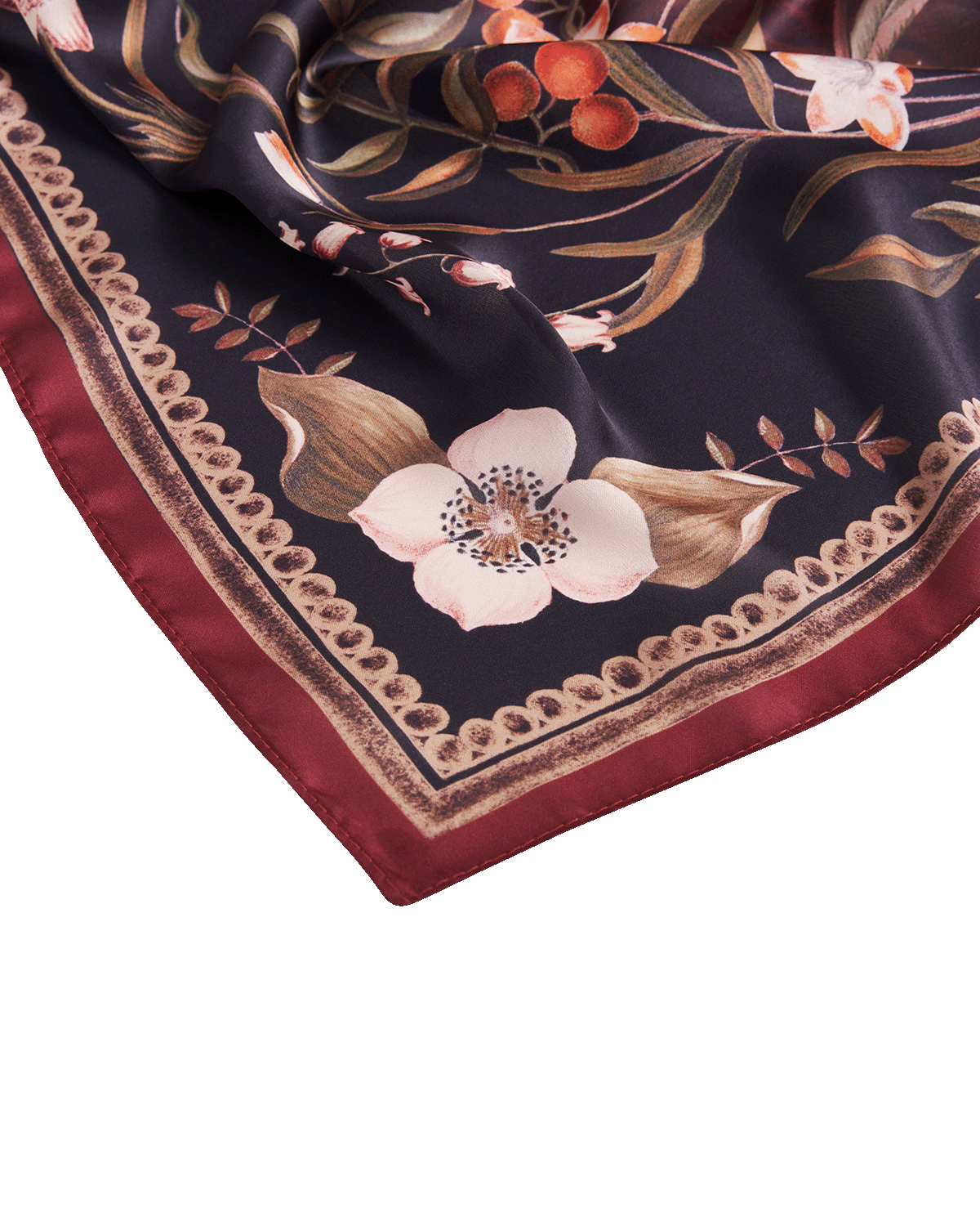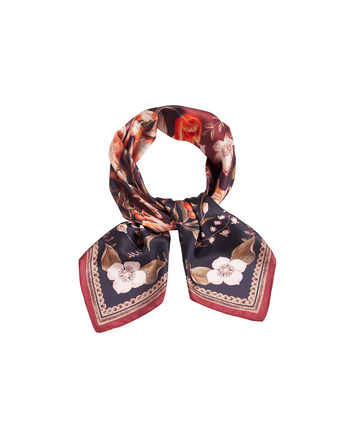 Woman in a beige dress with a patterned shawl holding a cherry red bag, standing in a garden.