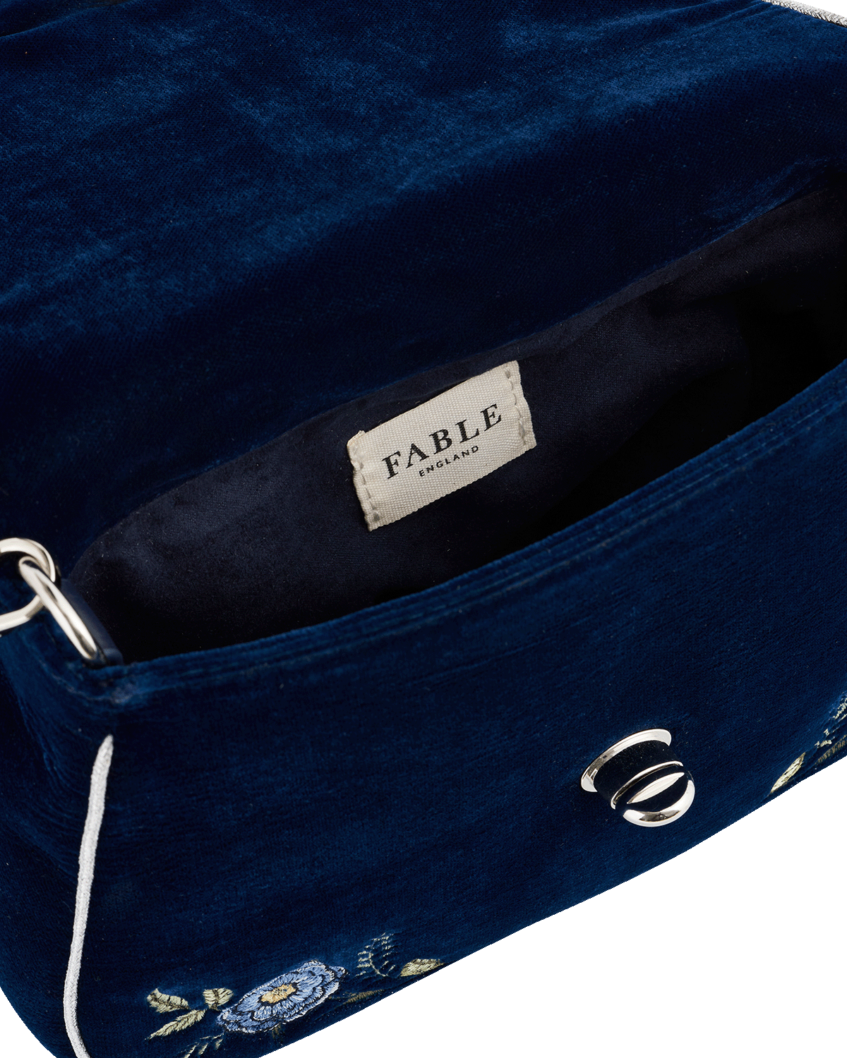 Navy blue fabric with floral embroidery and a silver buckle.
