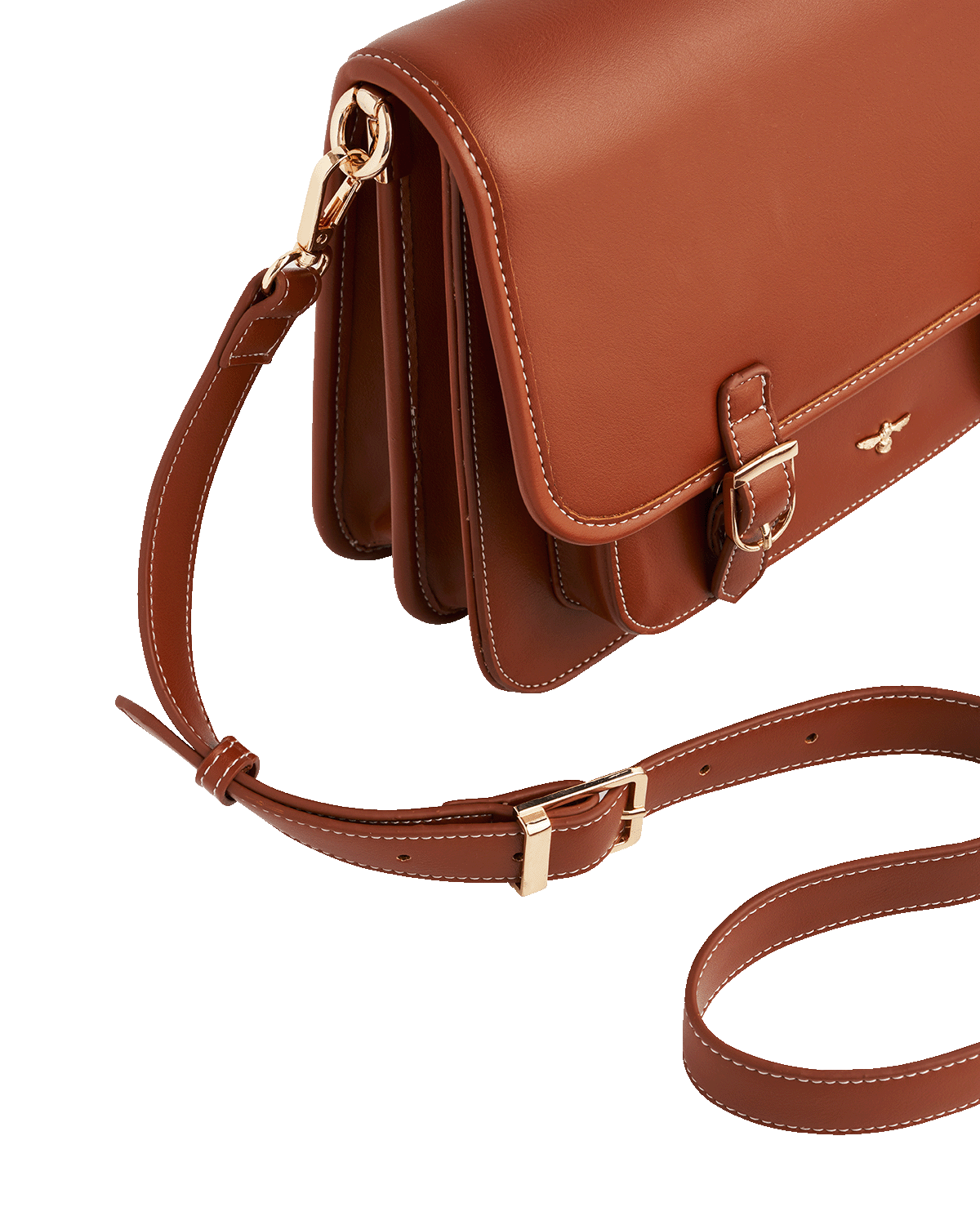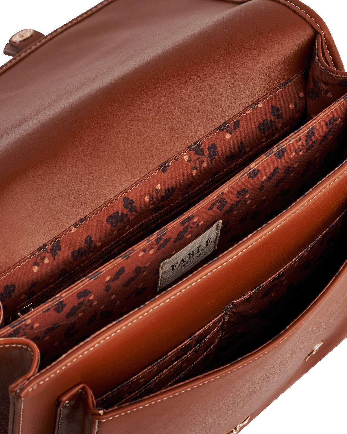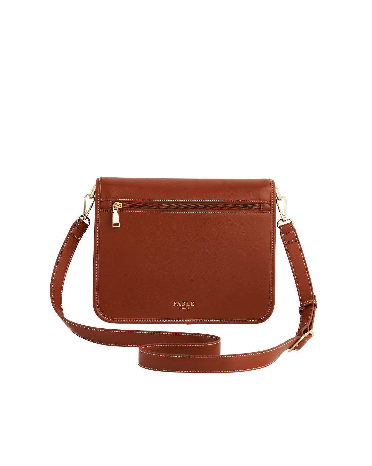 Brown leather crossbody bag with gold zipper and Fable England logo on a white background