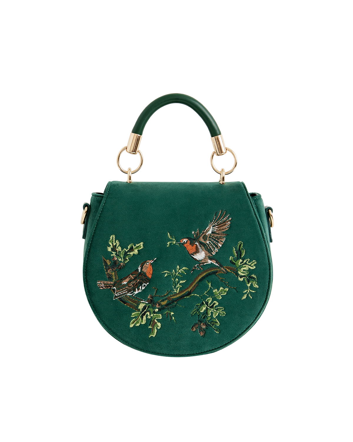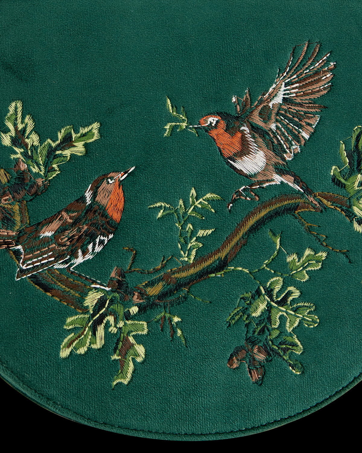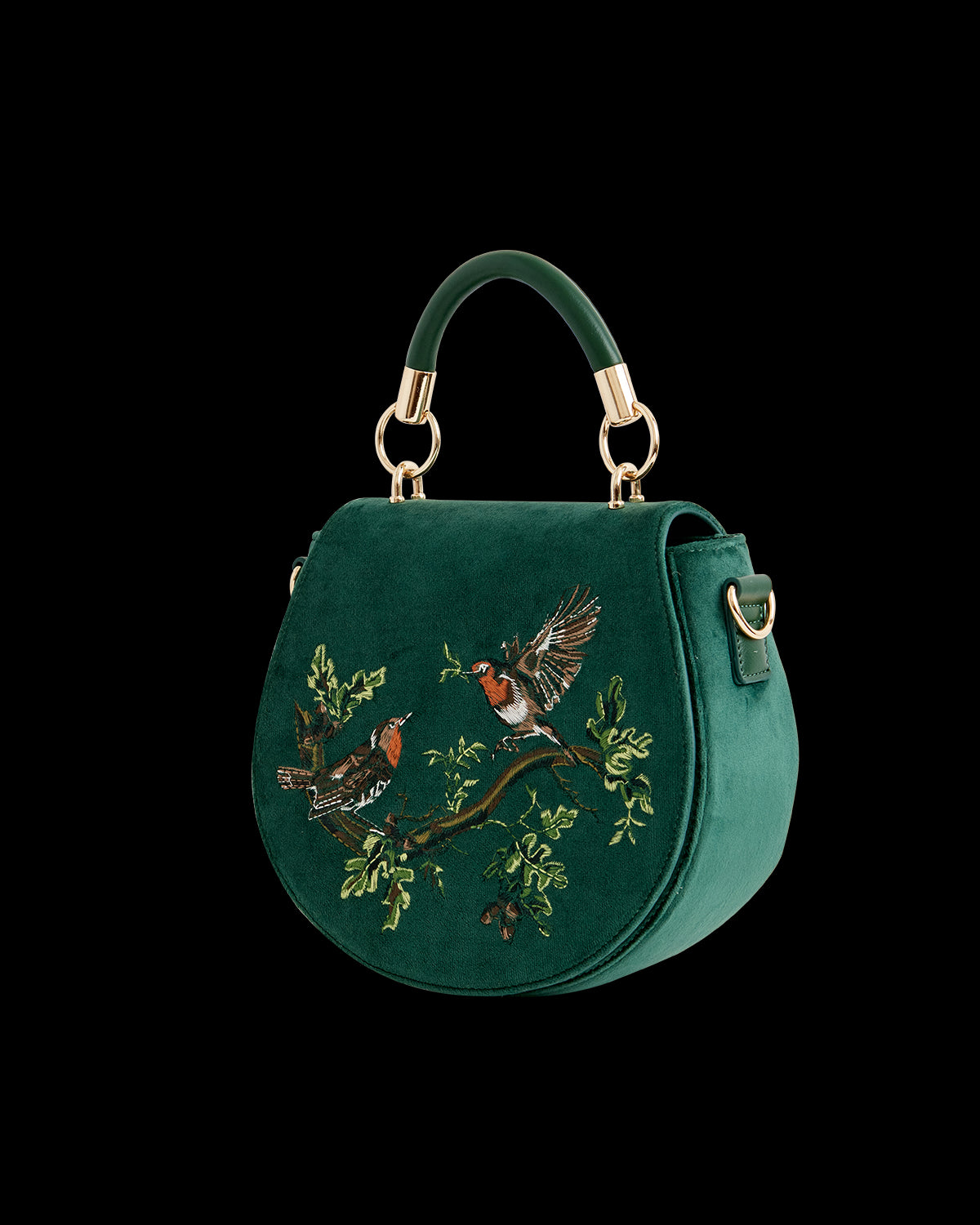 Sac demi-lune brodé Rouges-gorges amoureux en velours vert fougère