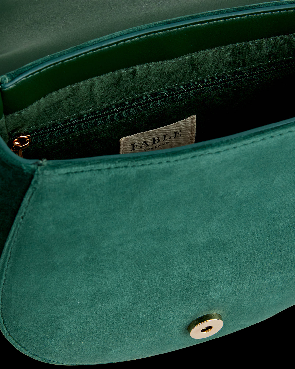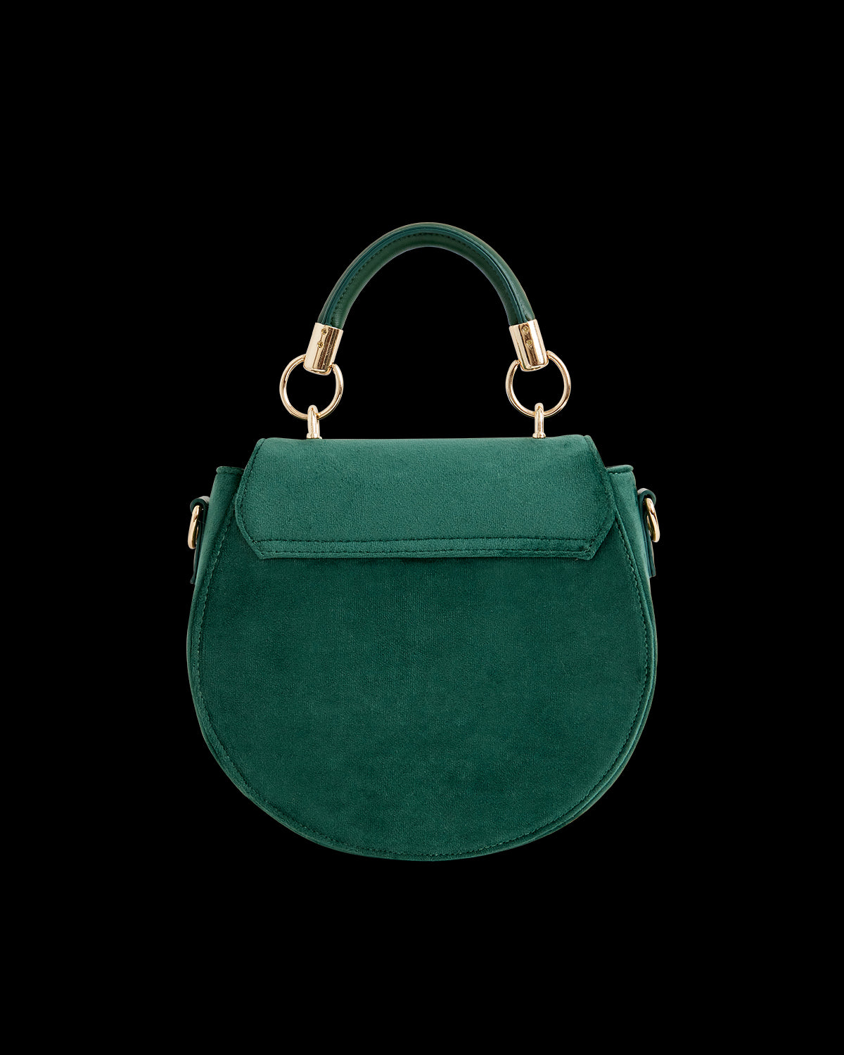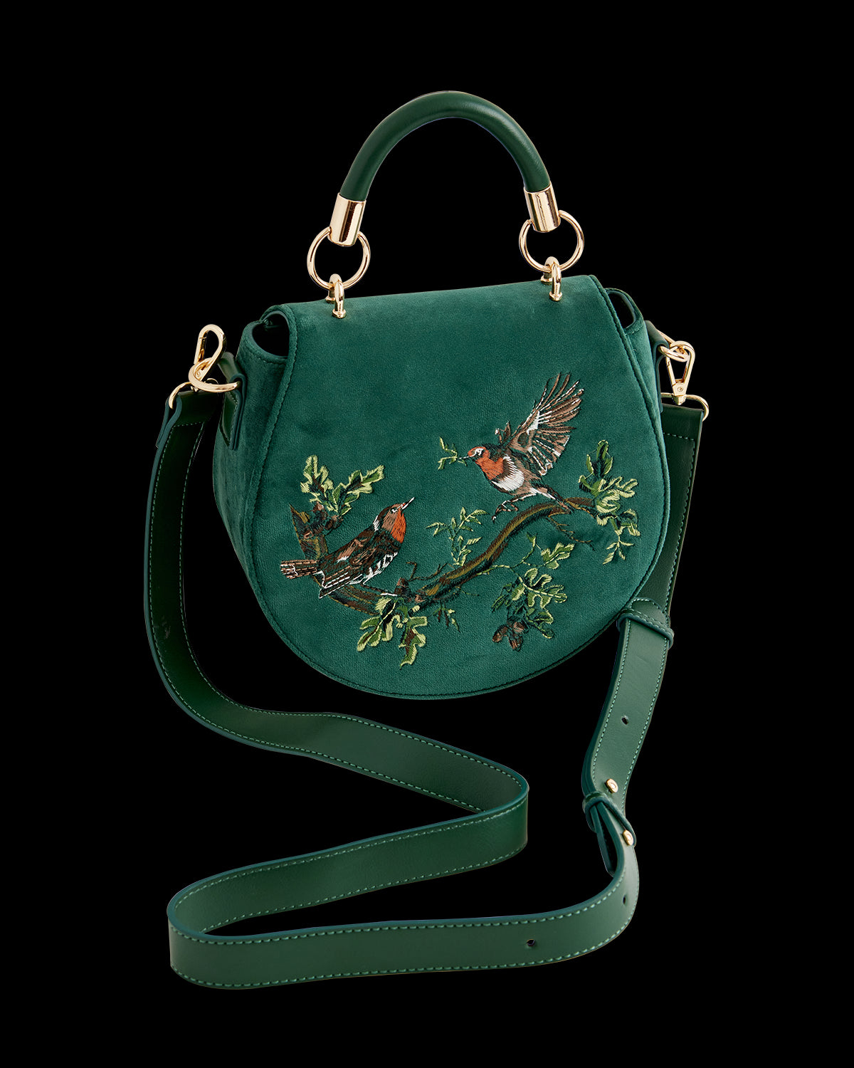 Sac demi-lune brodé Rouges-gorges amoureux en velours vert fougère