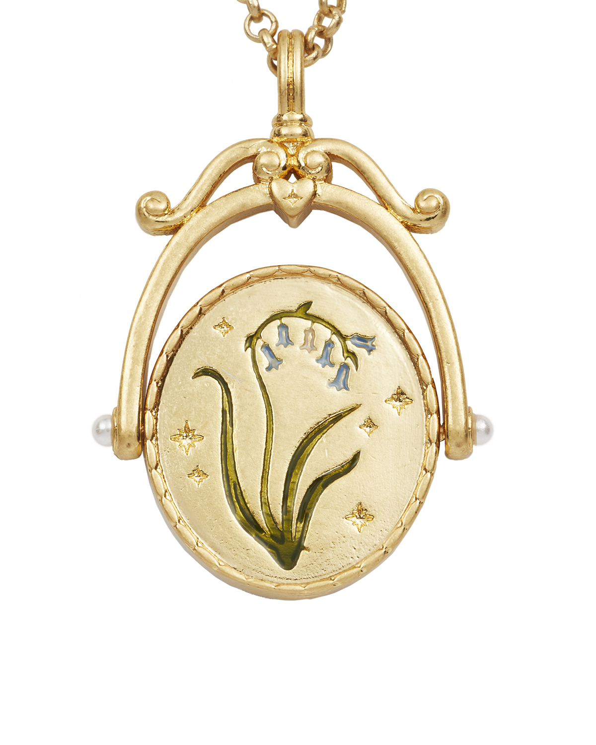 Materiali: ottone placcato oro 22ct, smalto, zirconi bianchi, perla