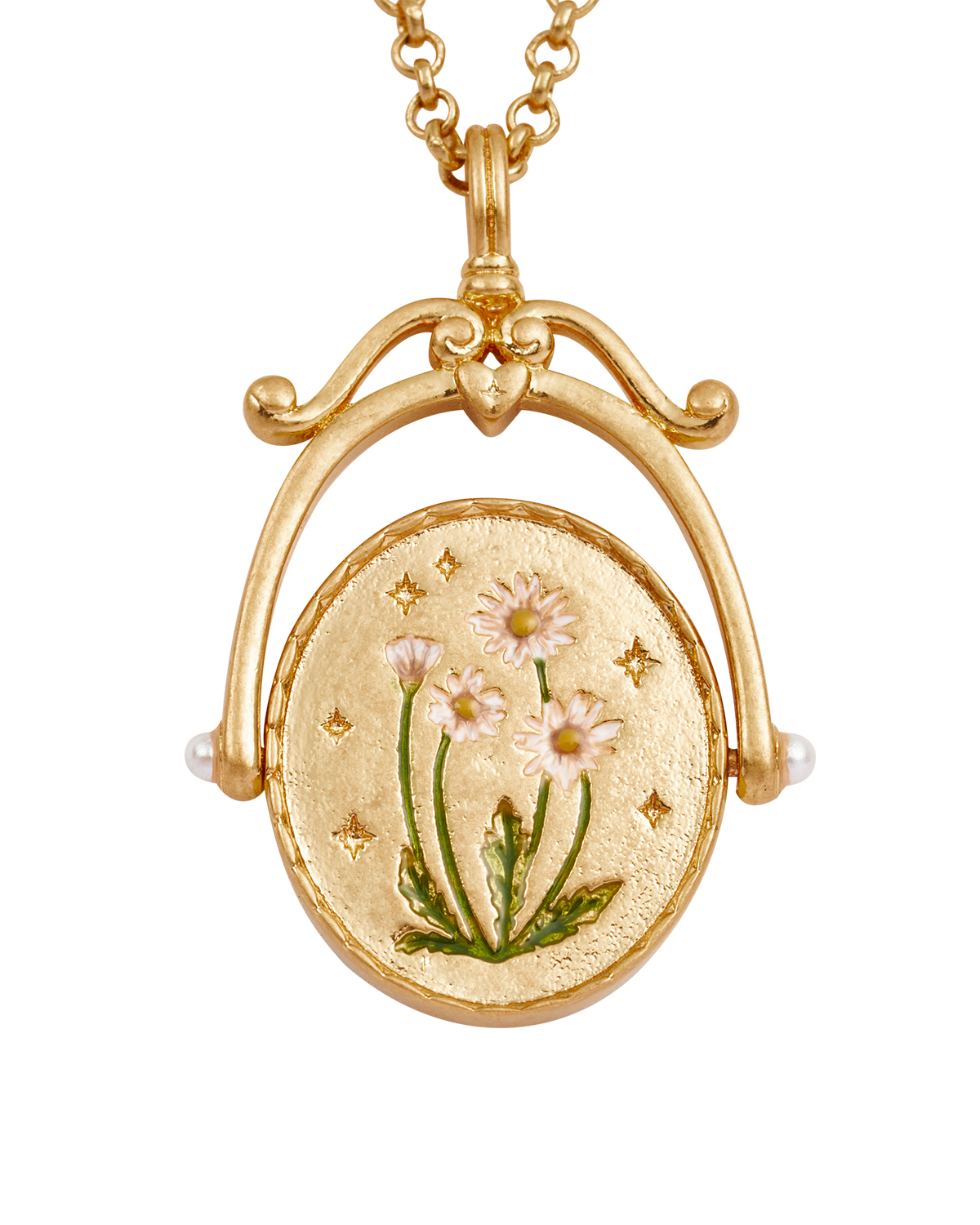 Materiali: ottone placcato oro 22ct, smalto, zirconi bianchi, perla