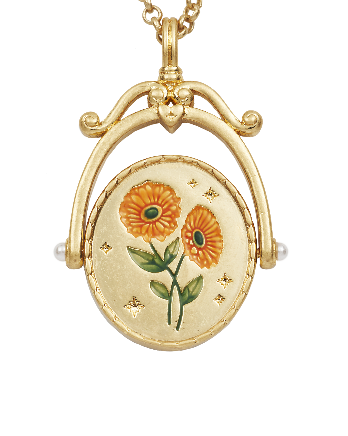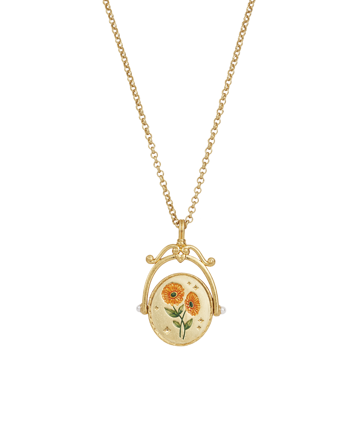 Materiali: ottone placcato oro 22ct, smalto, zirconi bianchi, perla