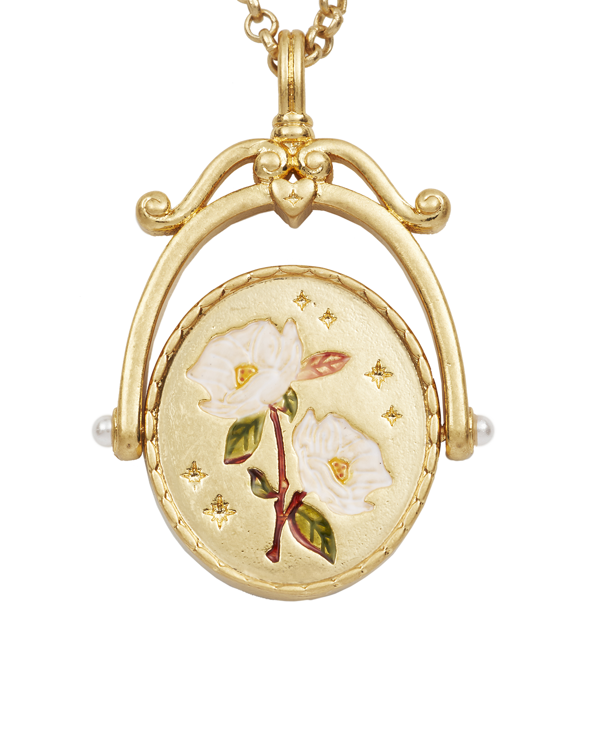 Materiali: ottone placcato oro 22ct, smalto, zirconi bianchi, perla