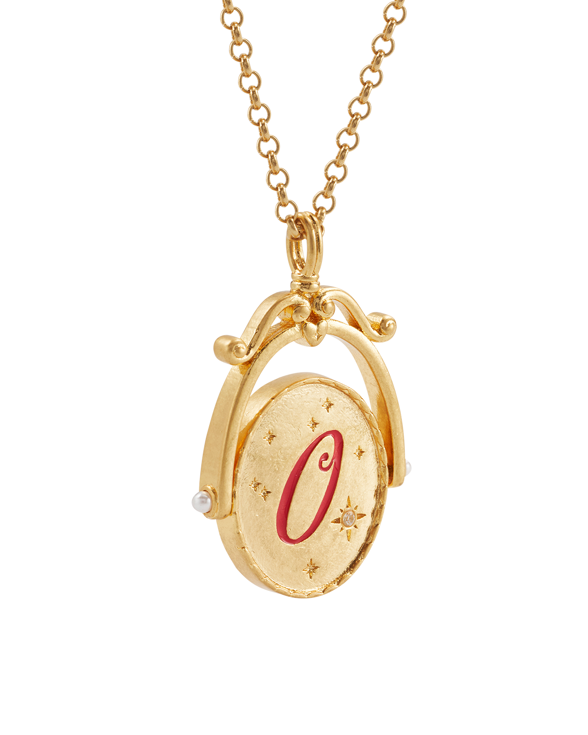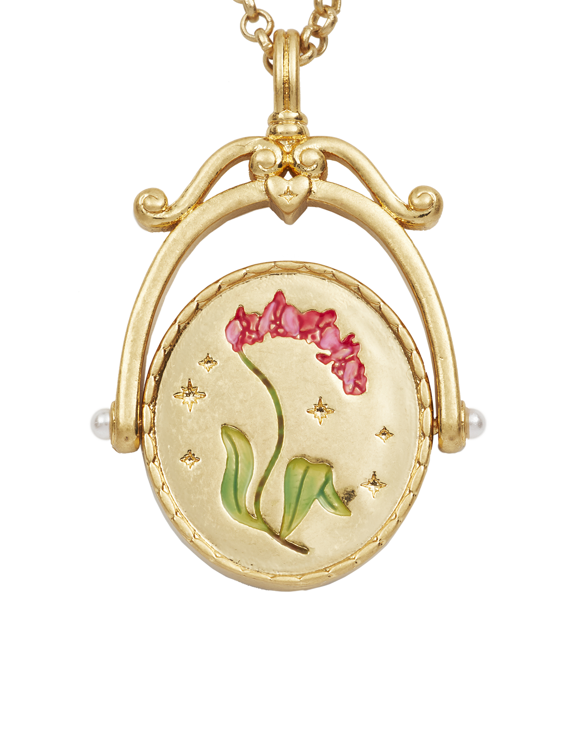 Materiali: ottone placcato oro 22ct, smalto, zirconi bianchi, perla