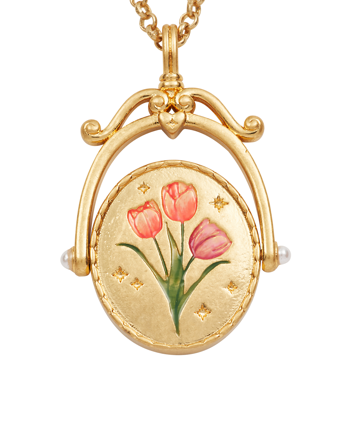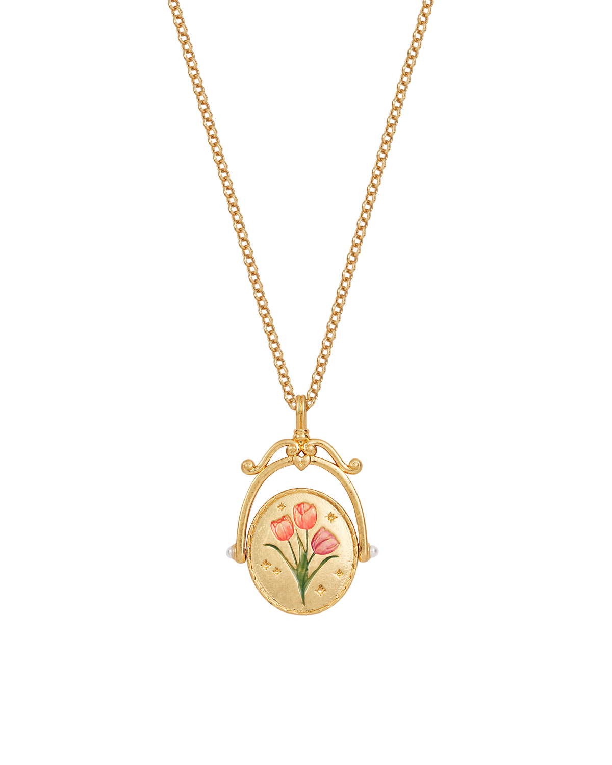 Materiali: ottone placcato oro 22ct, smalto, zirconi bianchi, perla