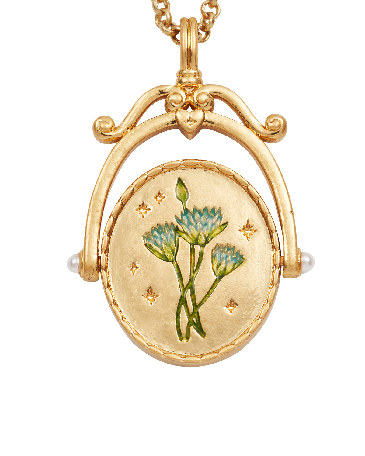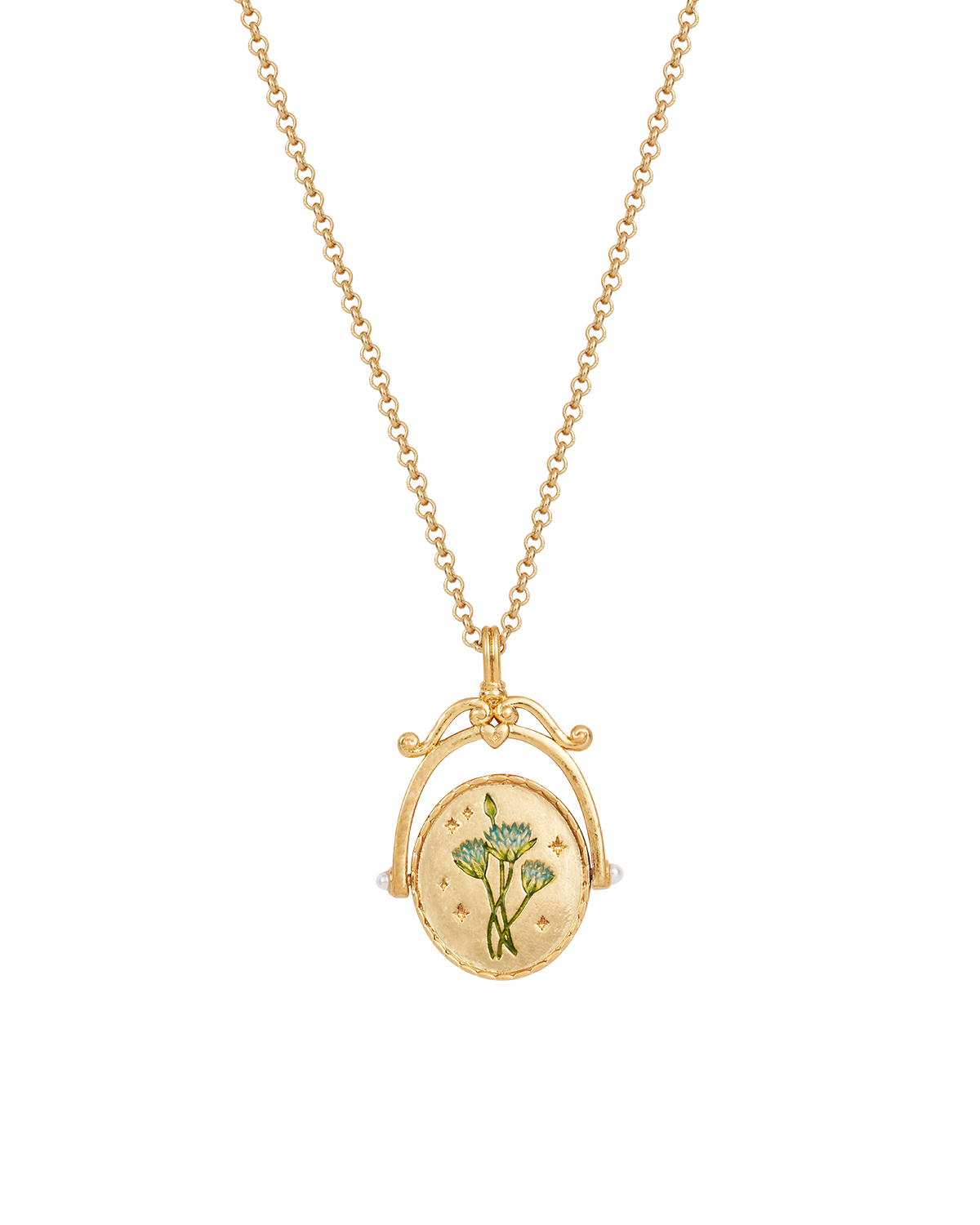 Materiali: ottone placcato oro 22ct, smalto, zirconi bianchi, perla