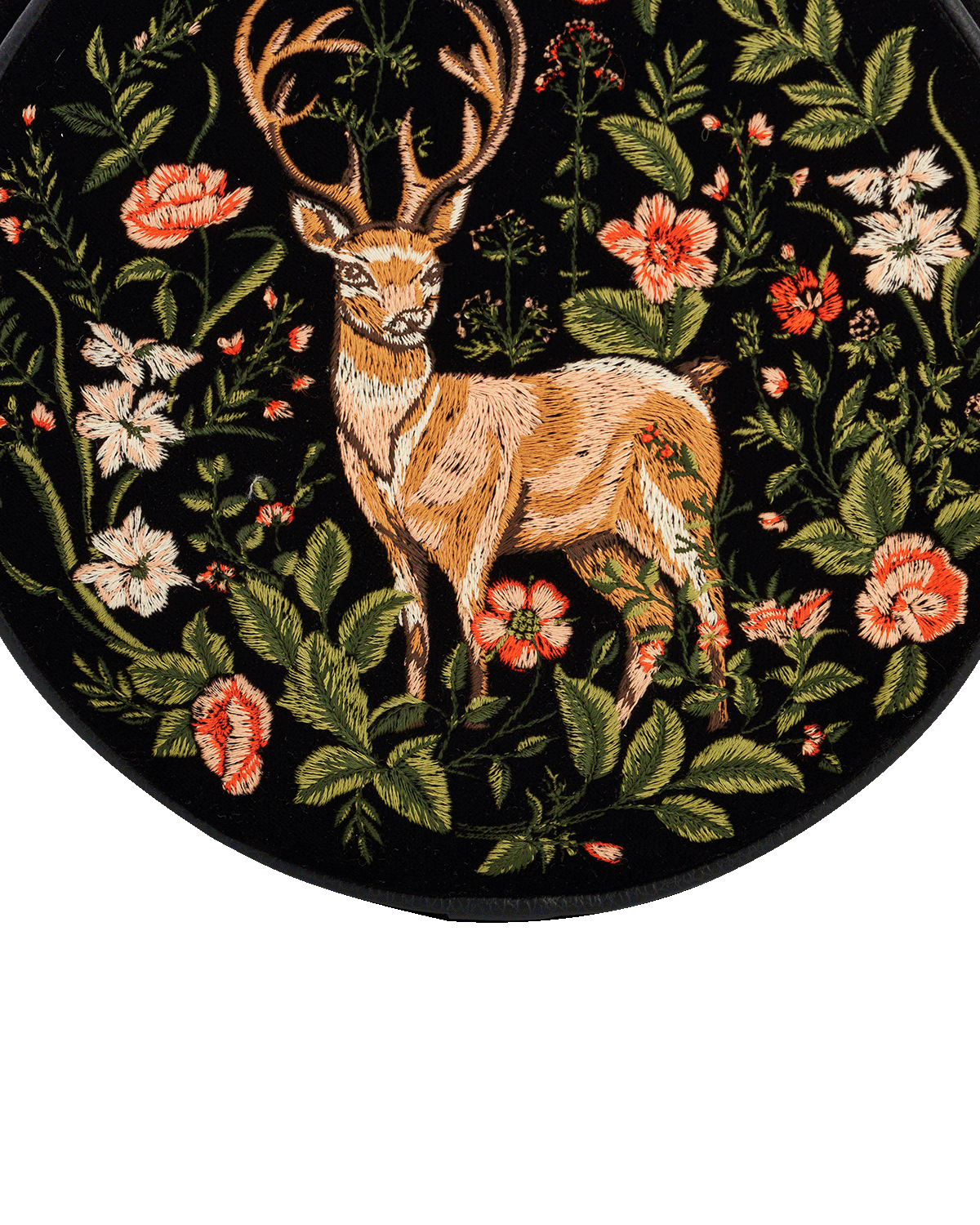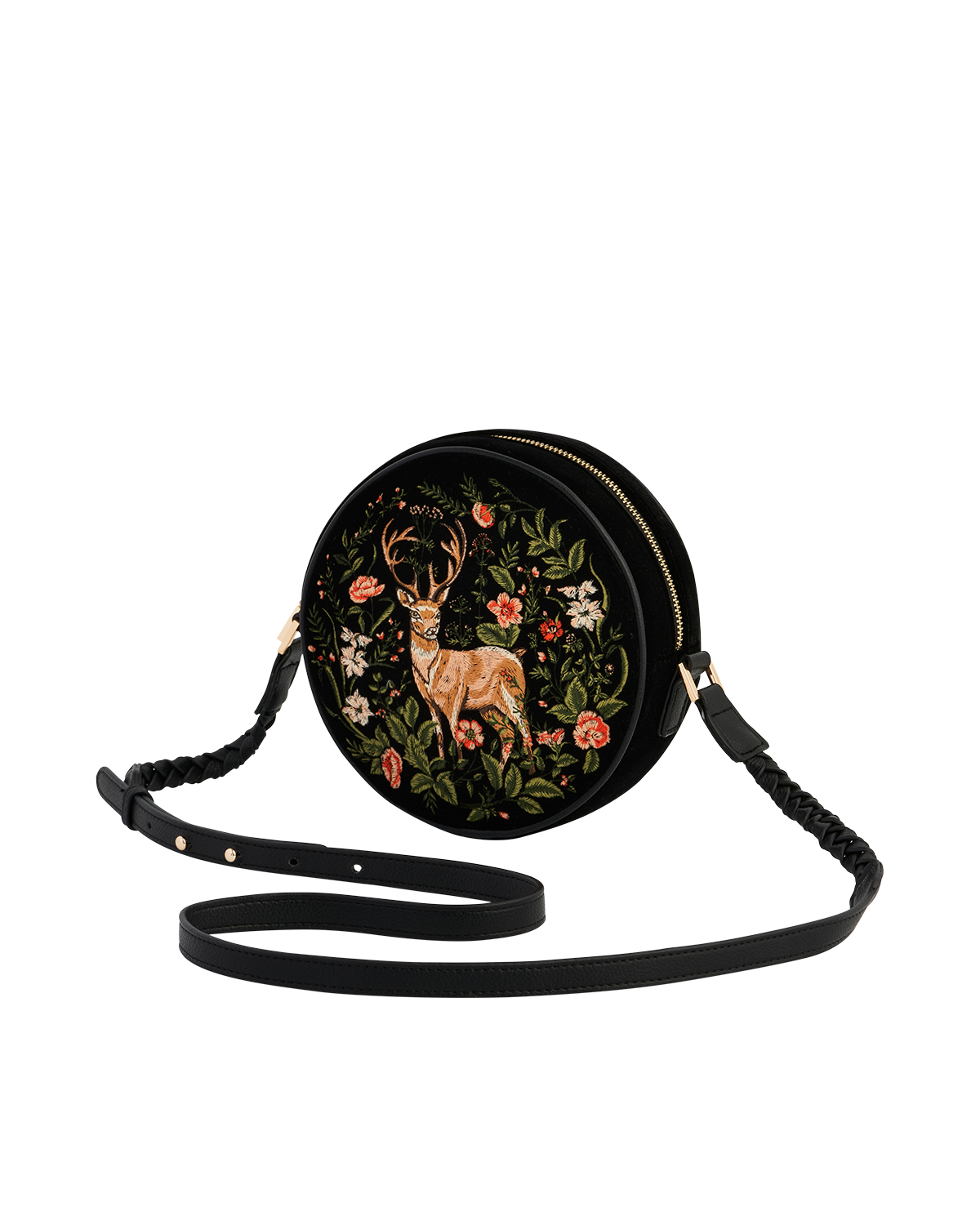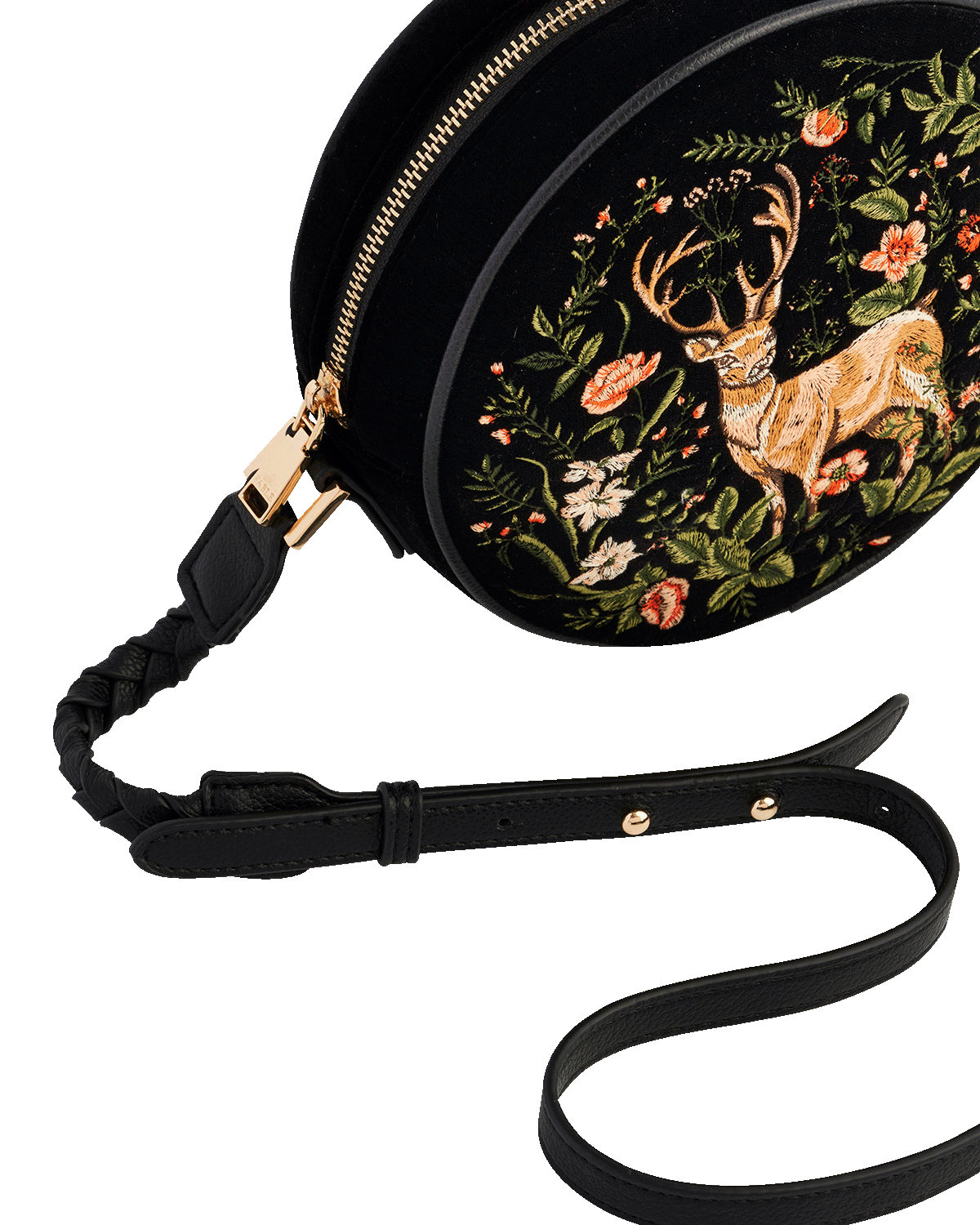 Woman holding a black round bag with floral and deer embroidery on a white background