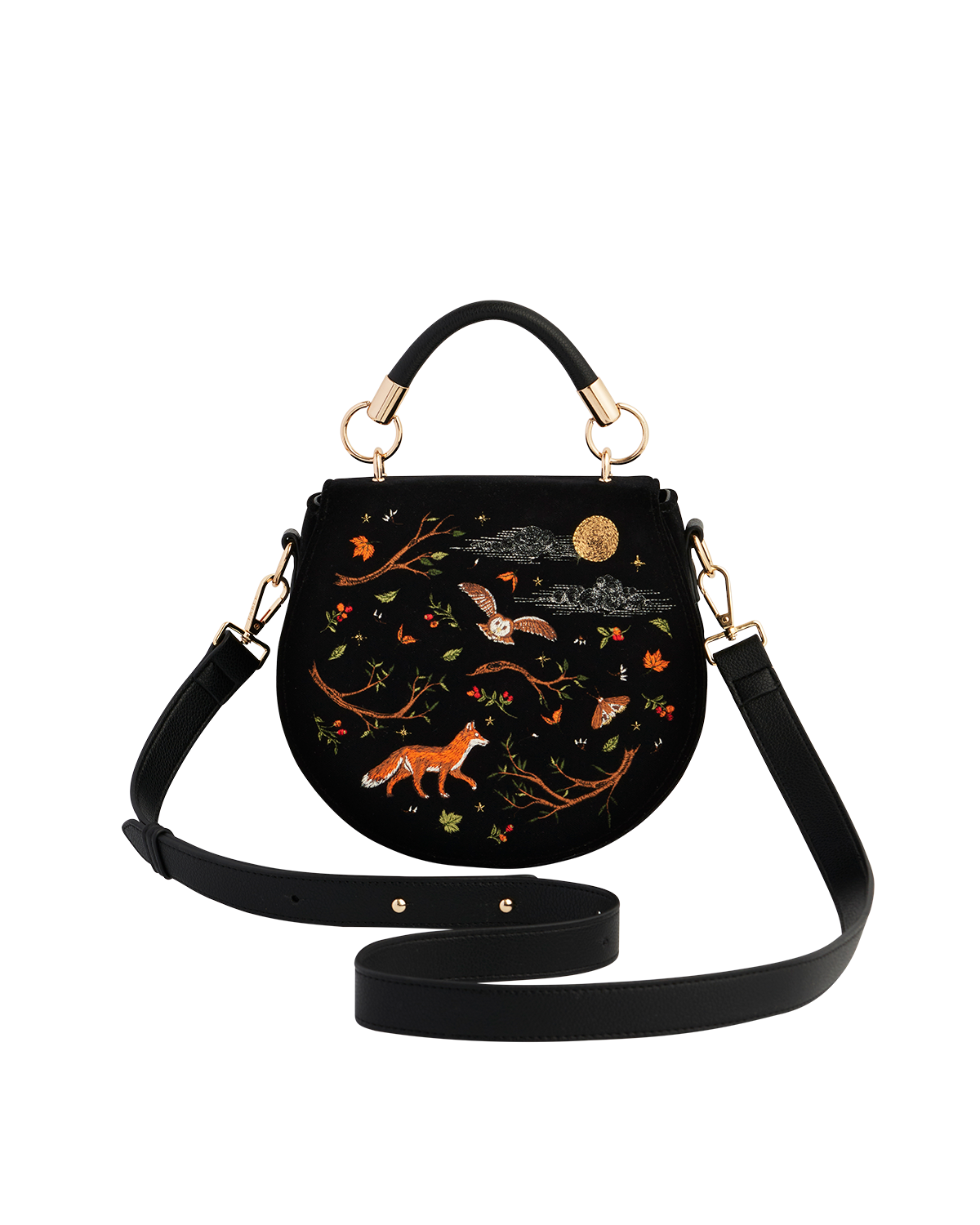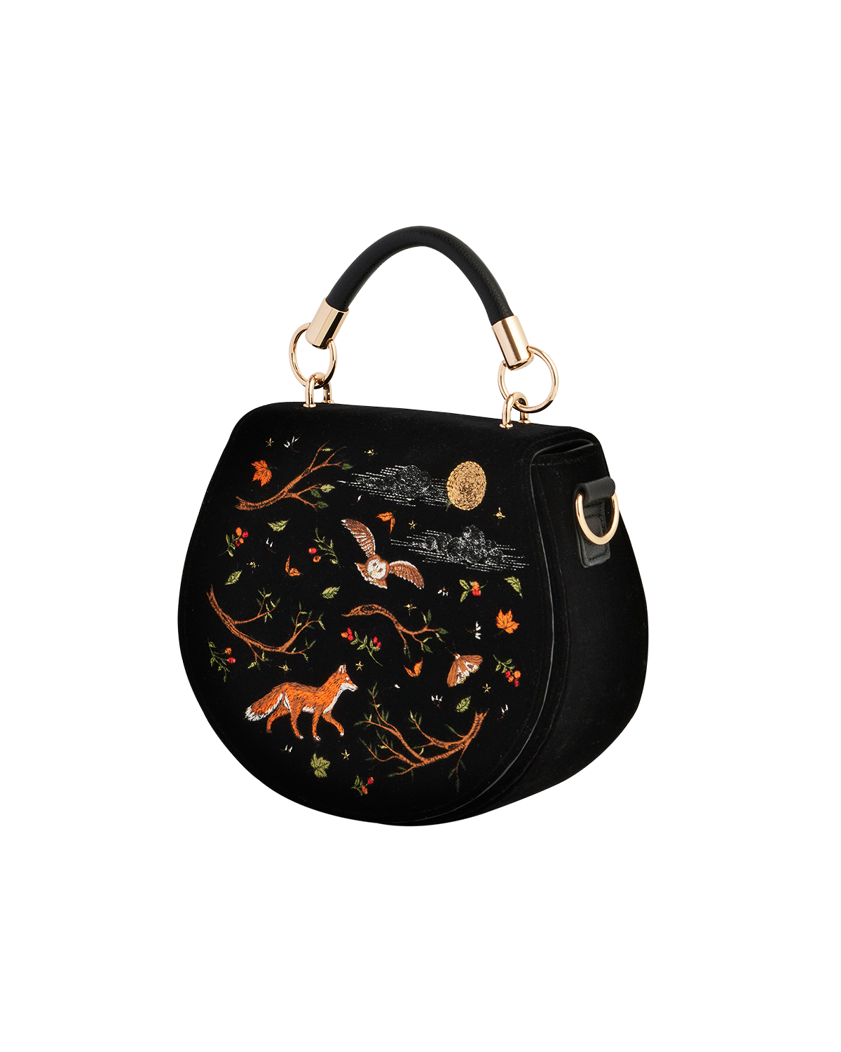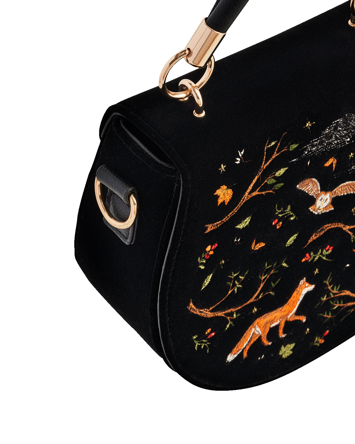 Black handbag with fox and nature-themed embroidery on a white background