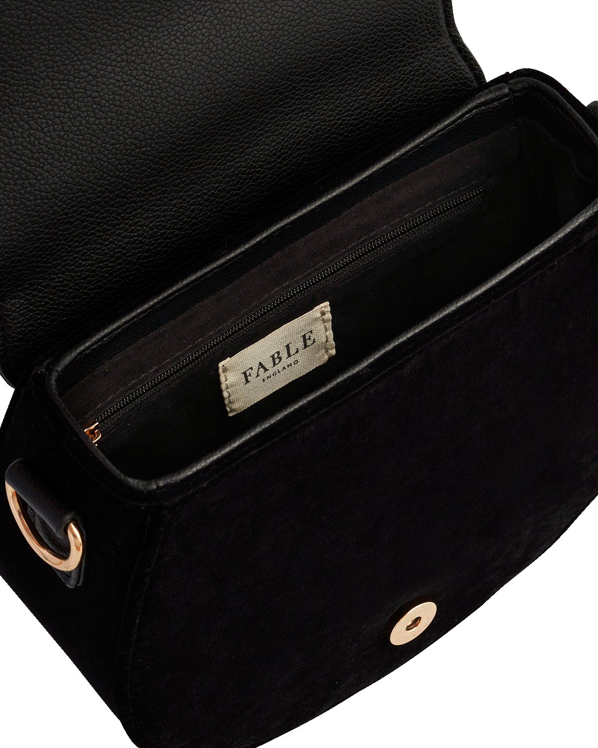 Black leather bag with 'Fable England' label on a white background