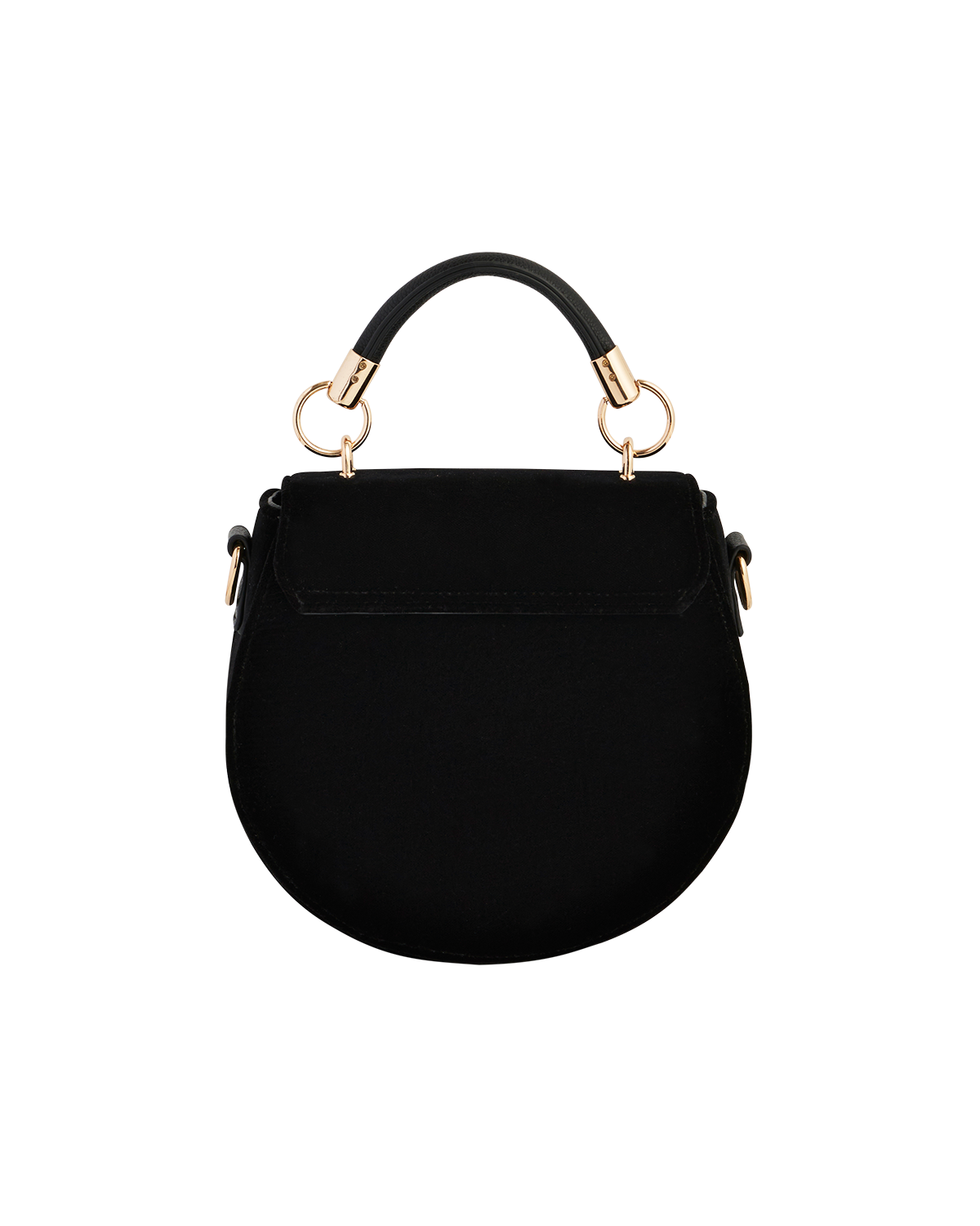 Black handbag with gold handles on a white background