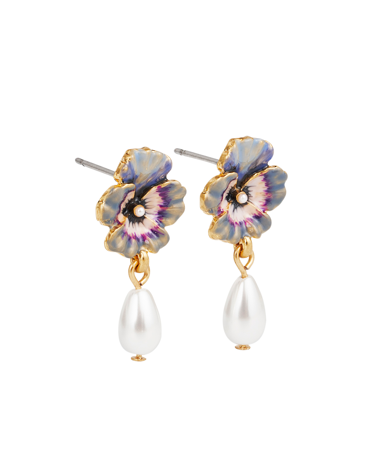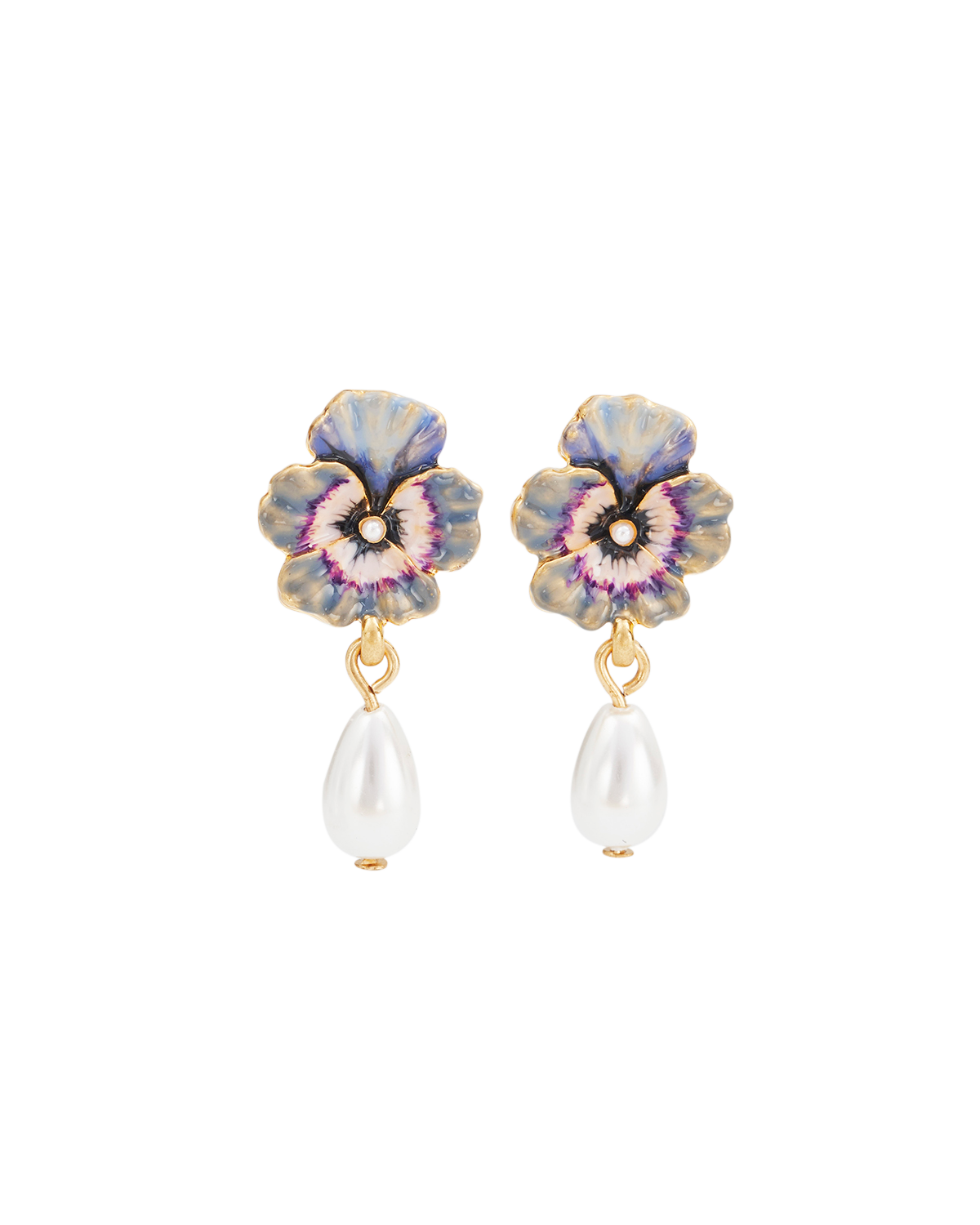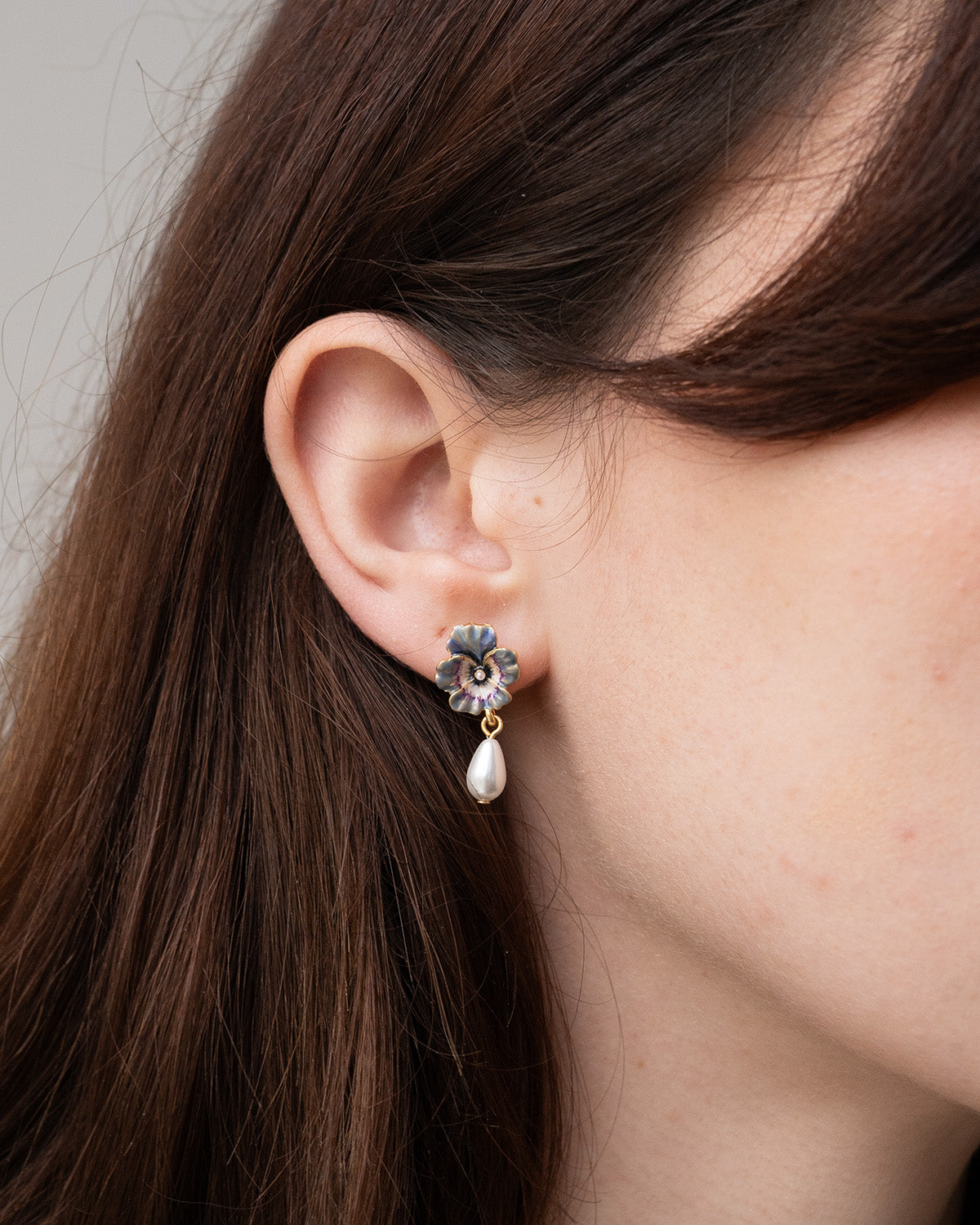 model wearing enamel pansy and pearl drop earrings on white background