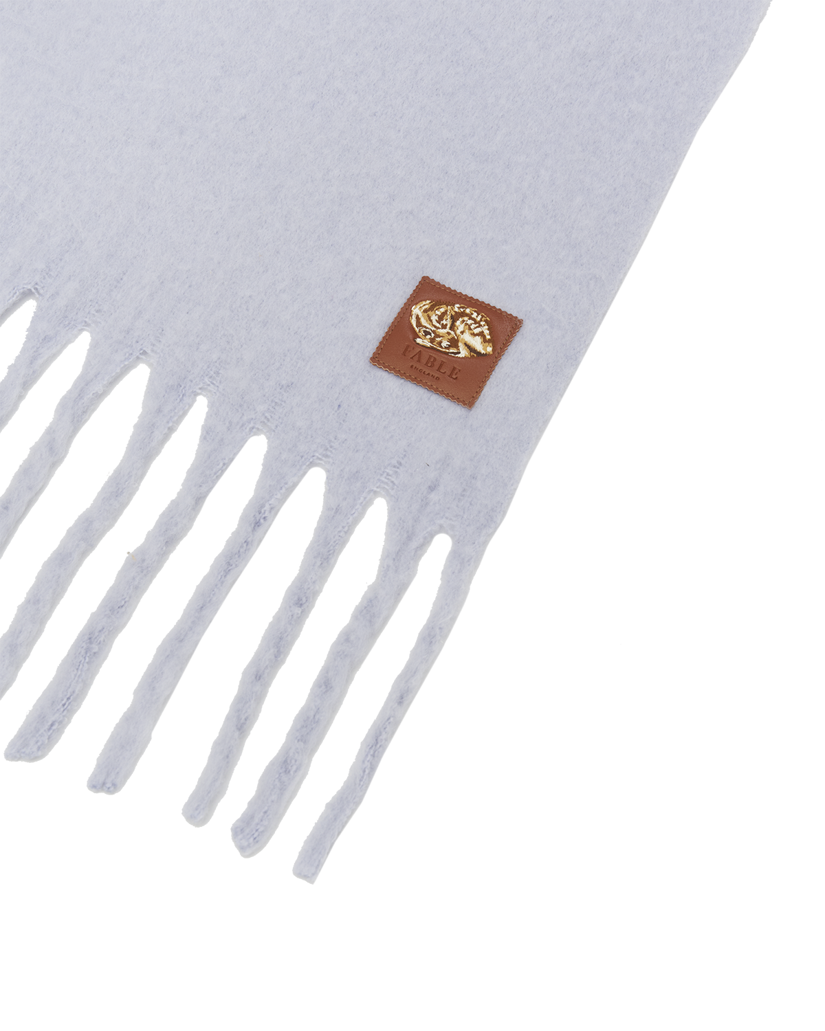 Gray scarf with white fringe and a brown logo patch on a light gray background