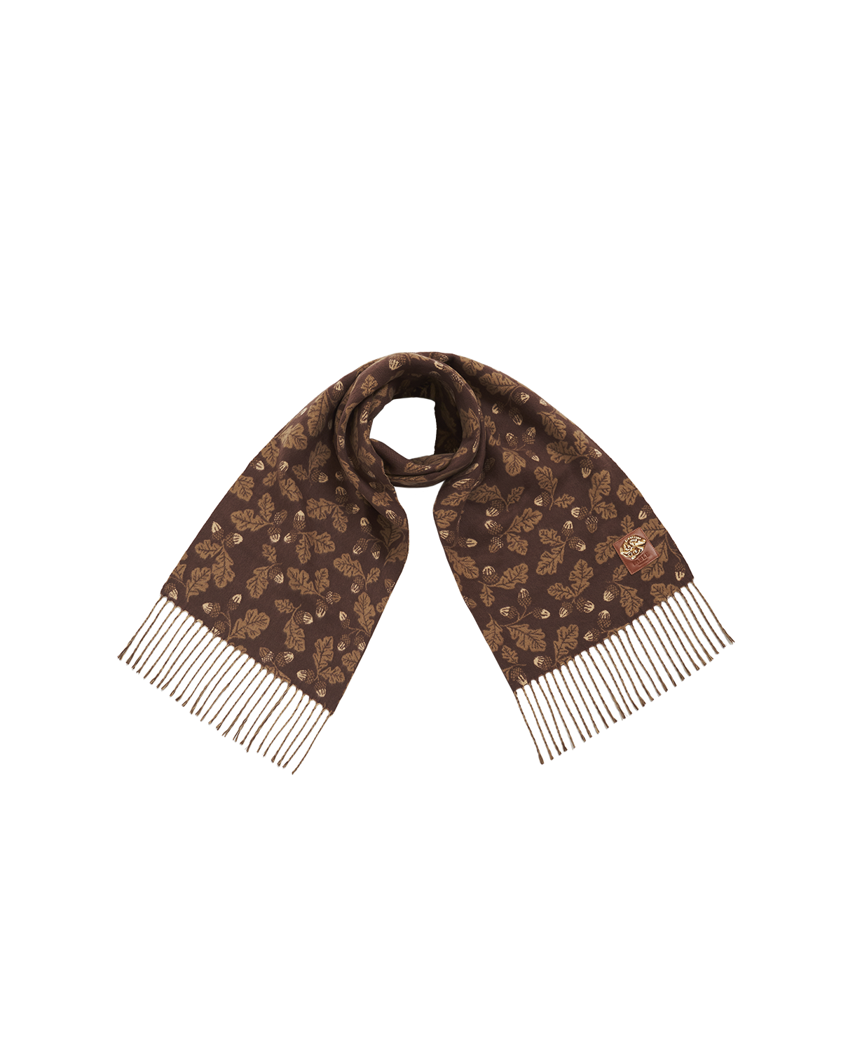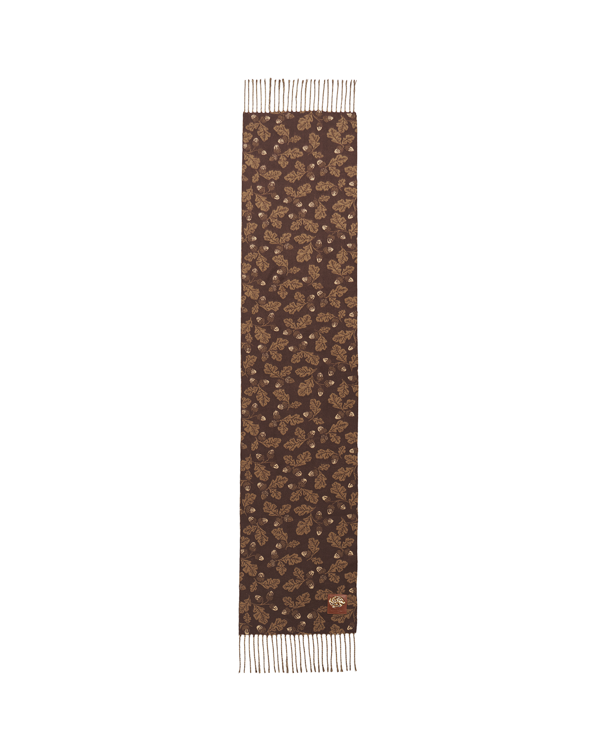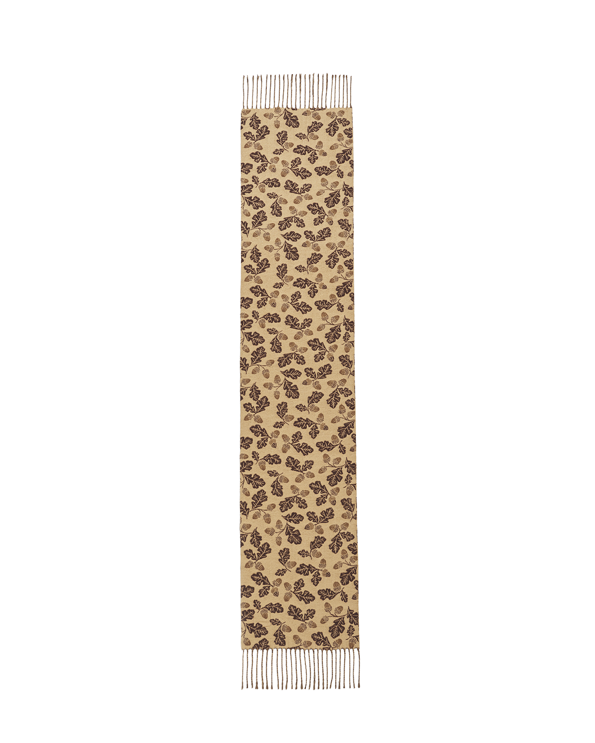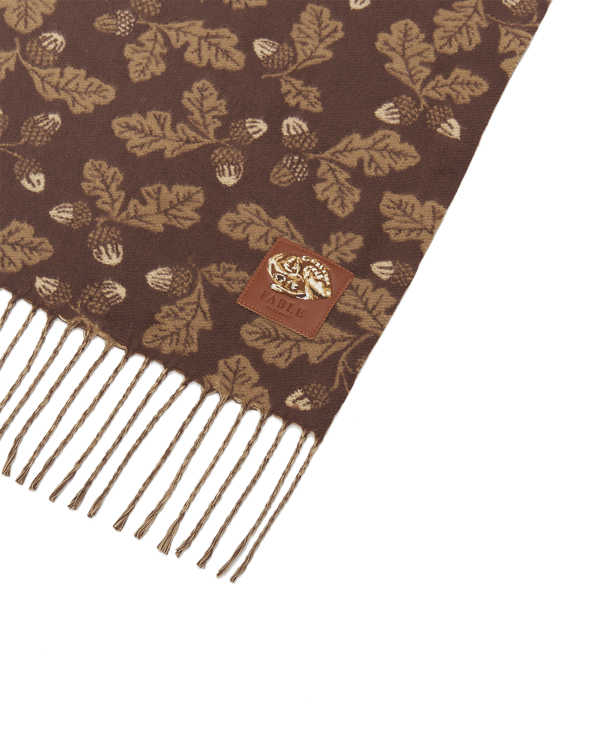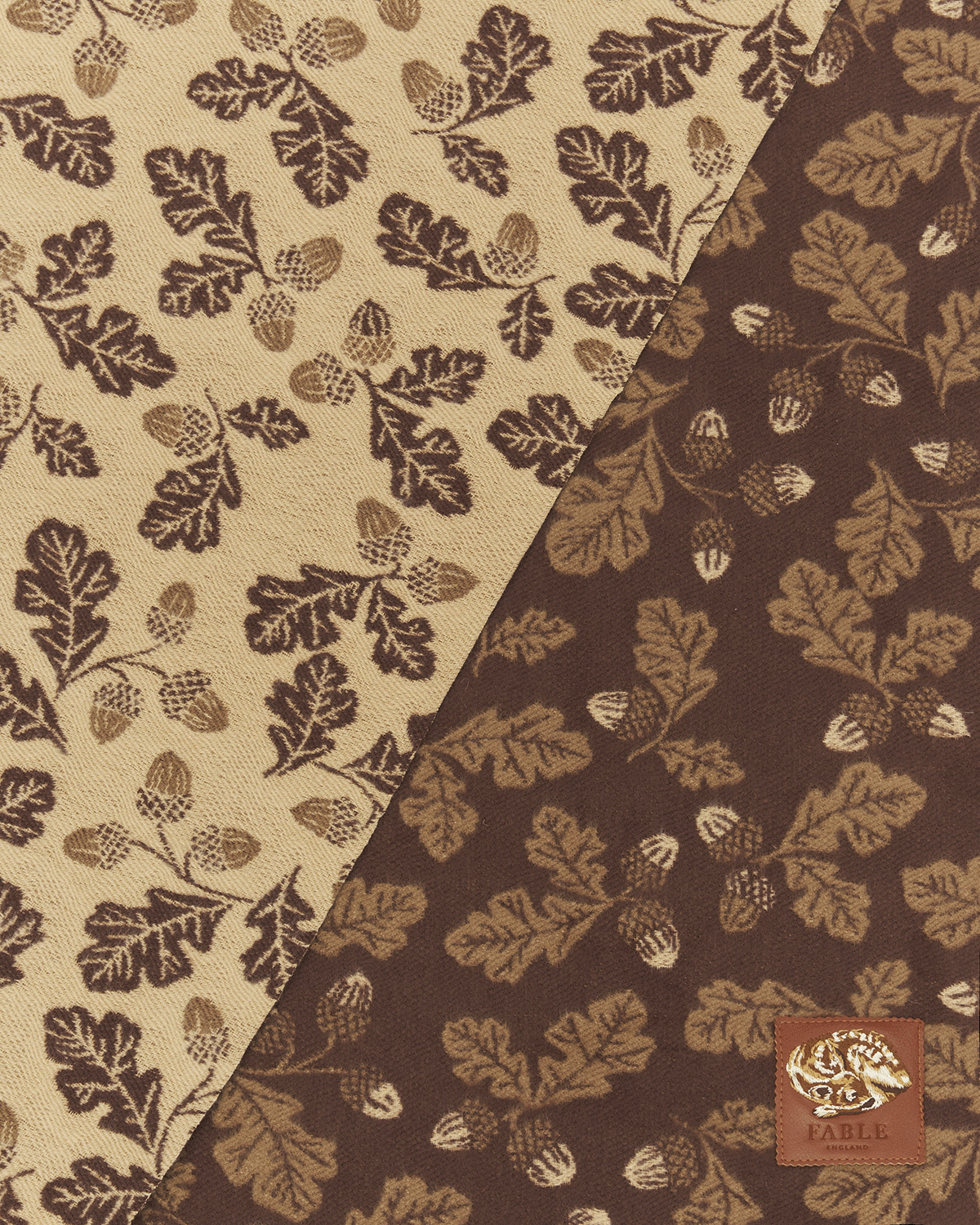 Two fabric swatches with leaf pattern, one beige and one brown, featuring a brand logo in the corner.