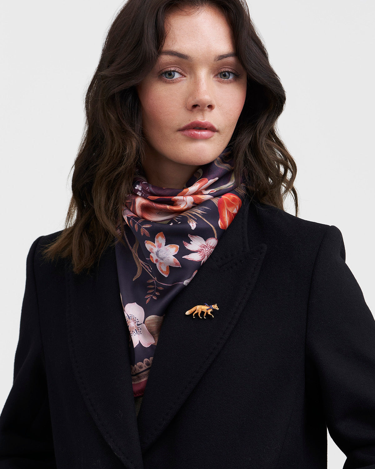 Woman wearing a black coat with a floral scarf and a brooch on a white background