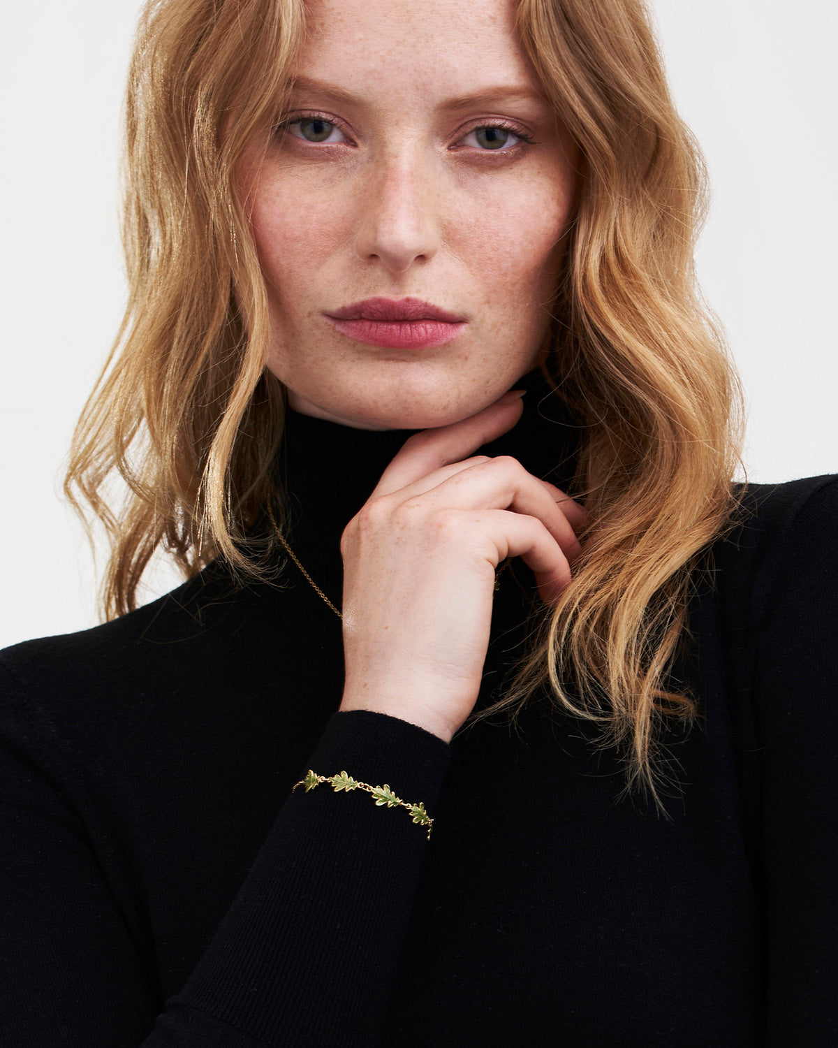 Woman wearing a black turtleneck and gold bracelet with a plain background