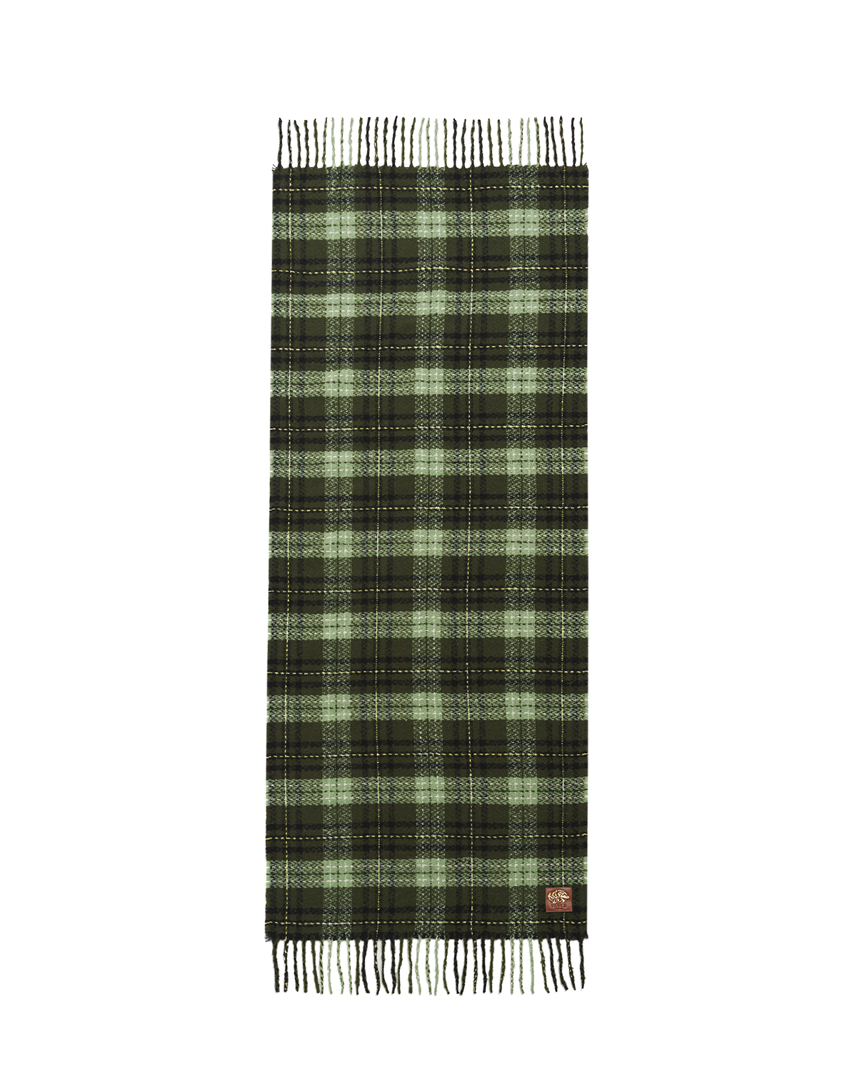 Woman wearing a green plaid scarf with a visible brand logo on a white background