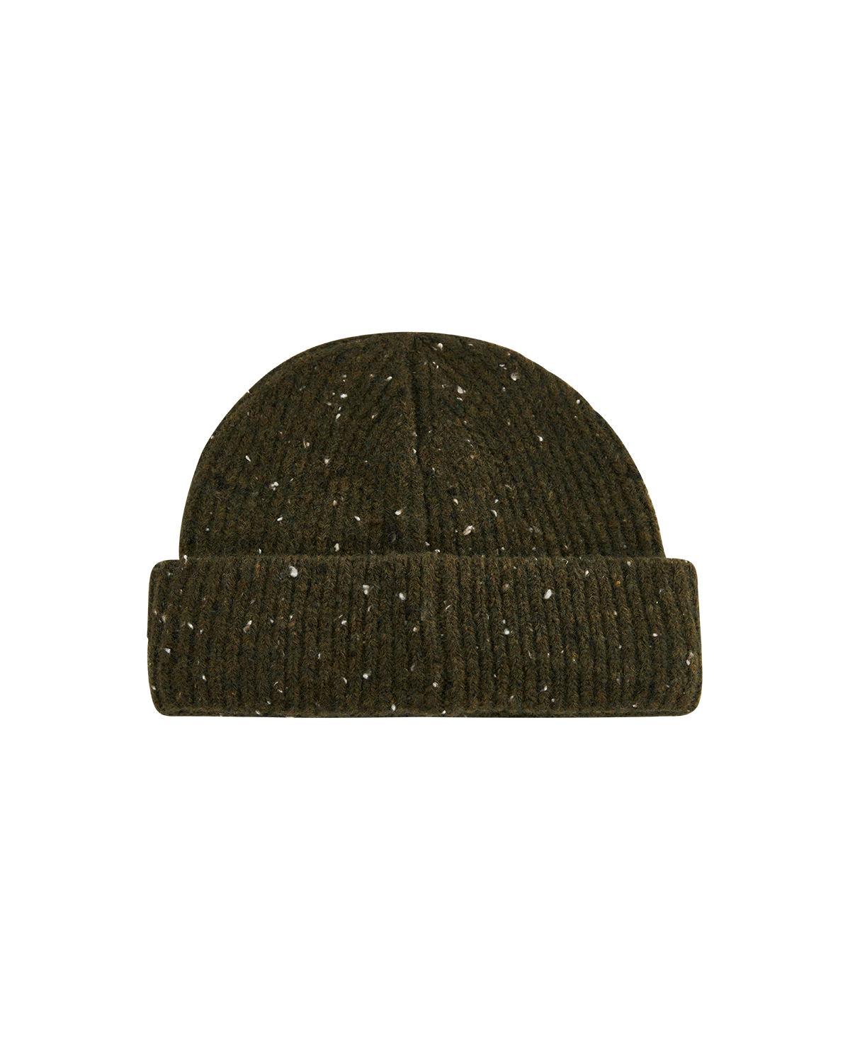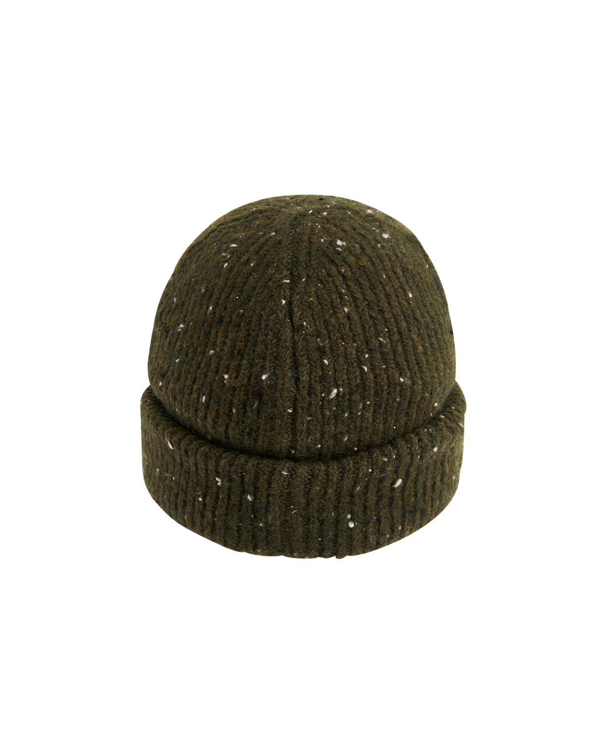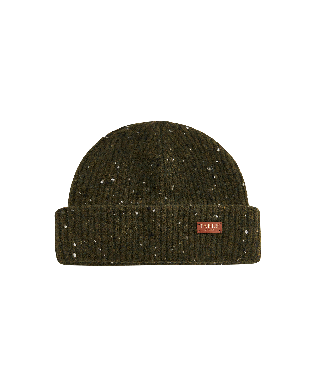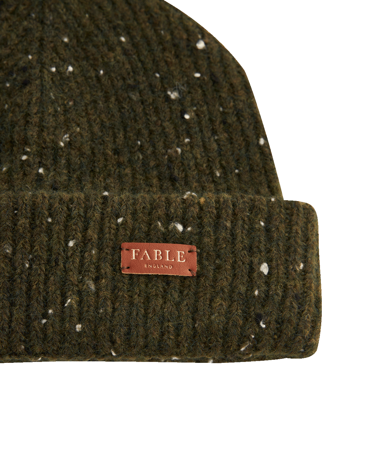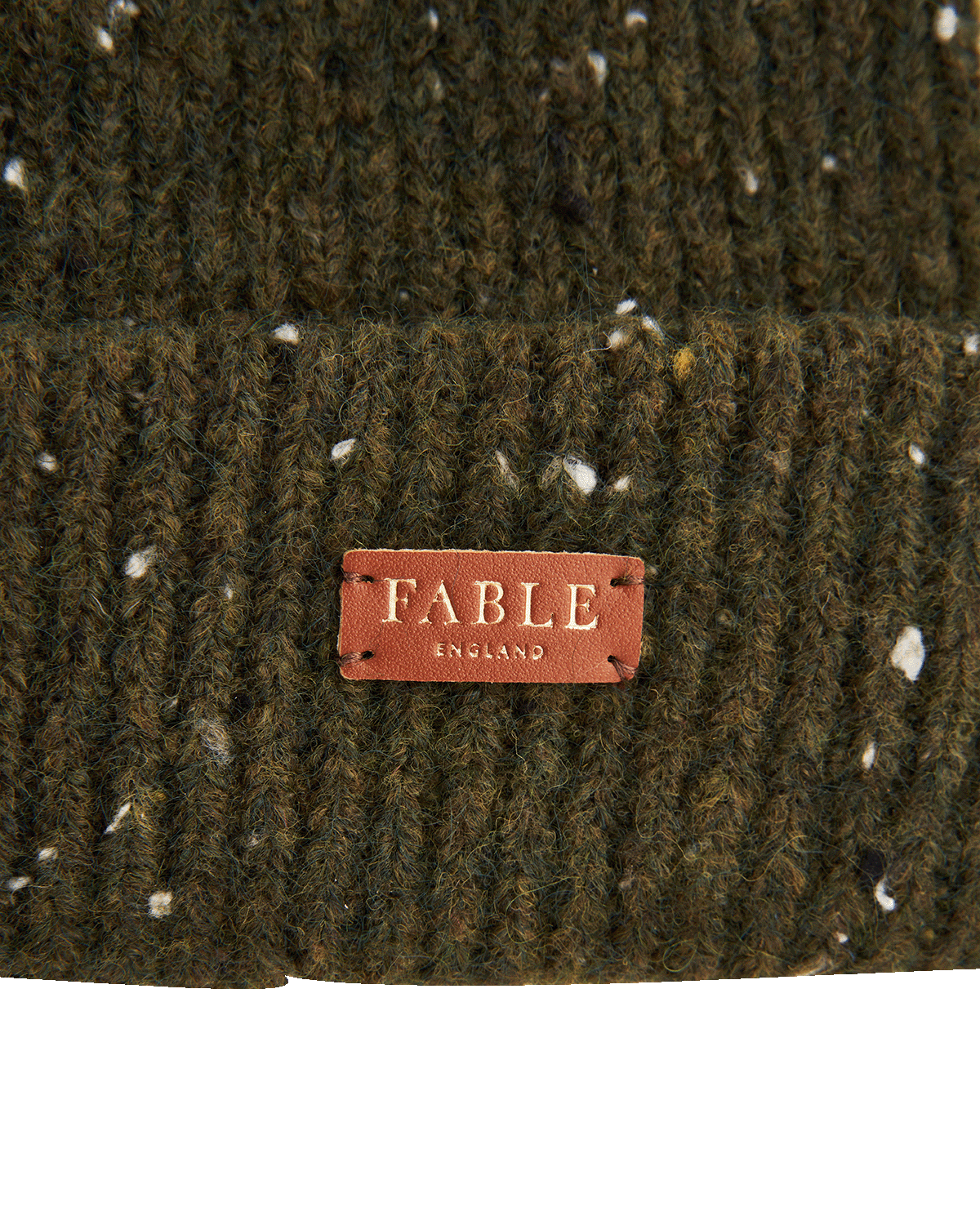 Green knit beanie with a brown leather patch labeled 'Fable England' on a white background