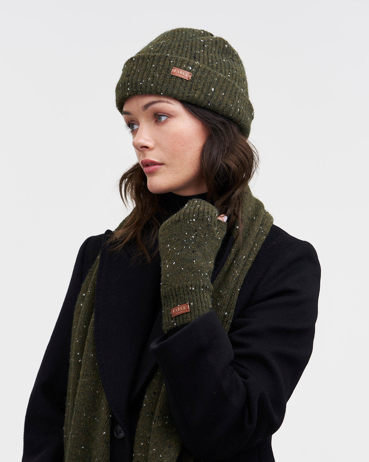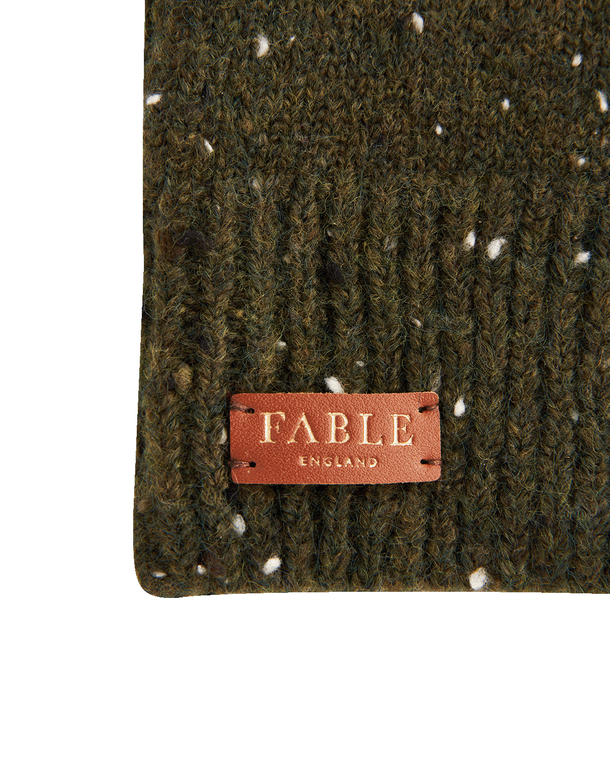 Woman wearing a green knit beanie and scarf with a Fable England logo on a white background