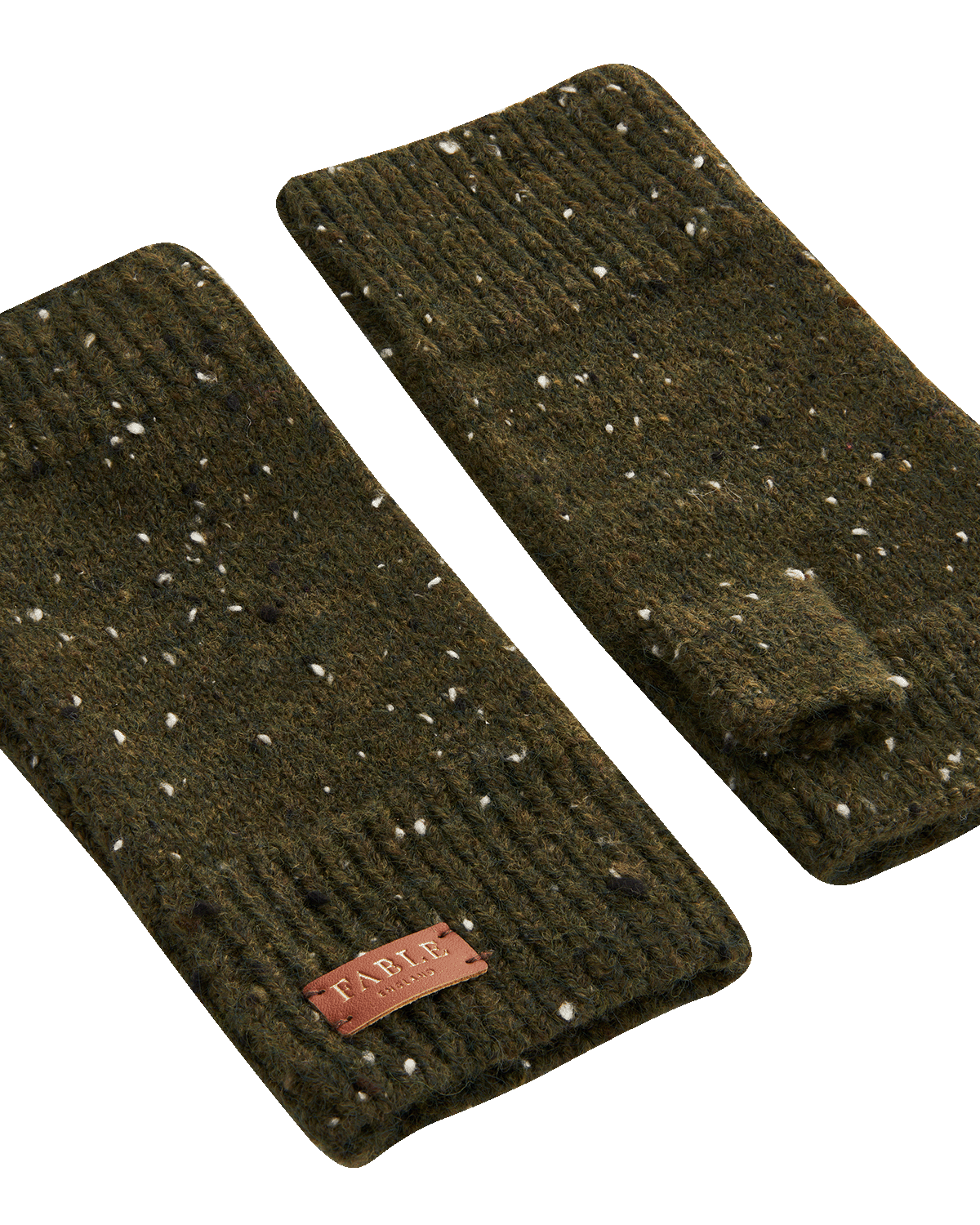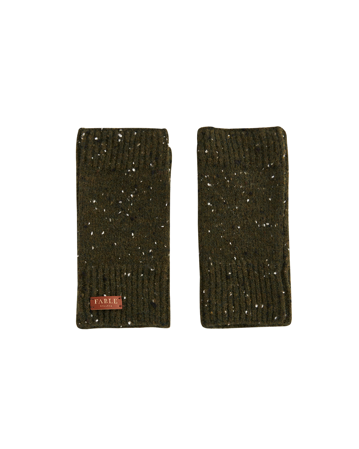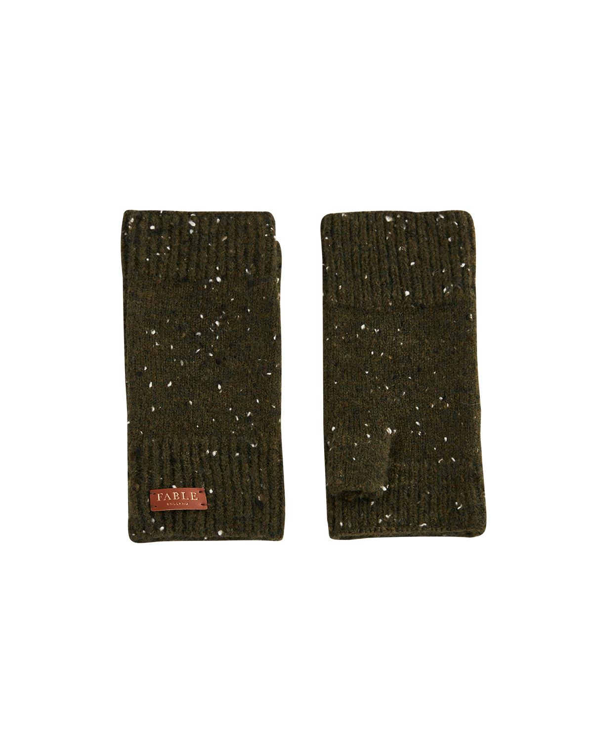 Pair of dark green knitted fingerless gloves with Fable England label on a white background
