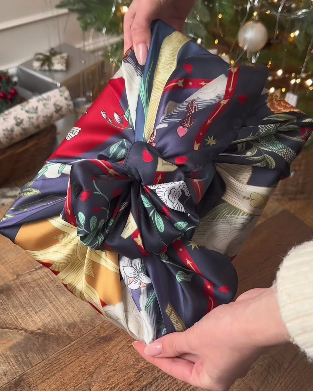 Woman holding the Freya's Heart Navy Story Square Scarf on white background