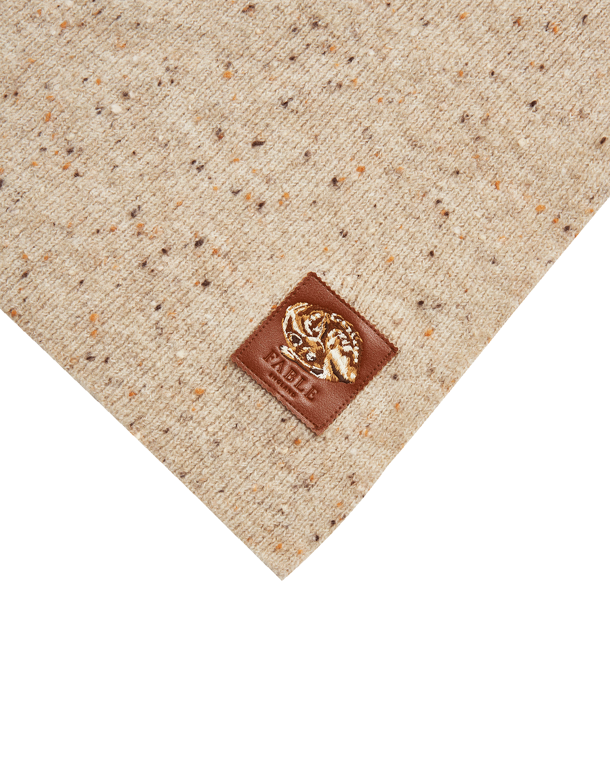 taupe fabric with a brown Fable England logo patch on a white background