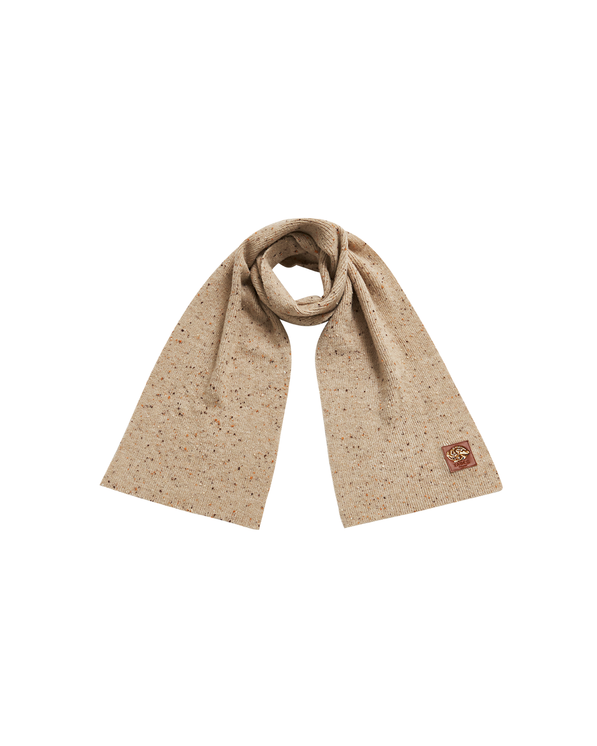Taupe textured scarf with a small logo on a white background